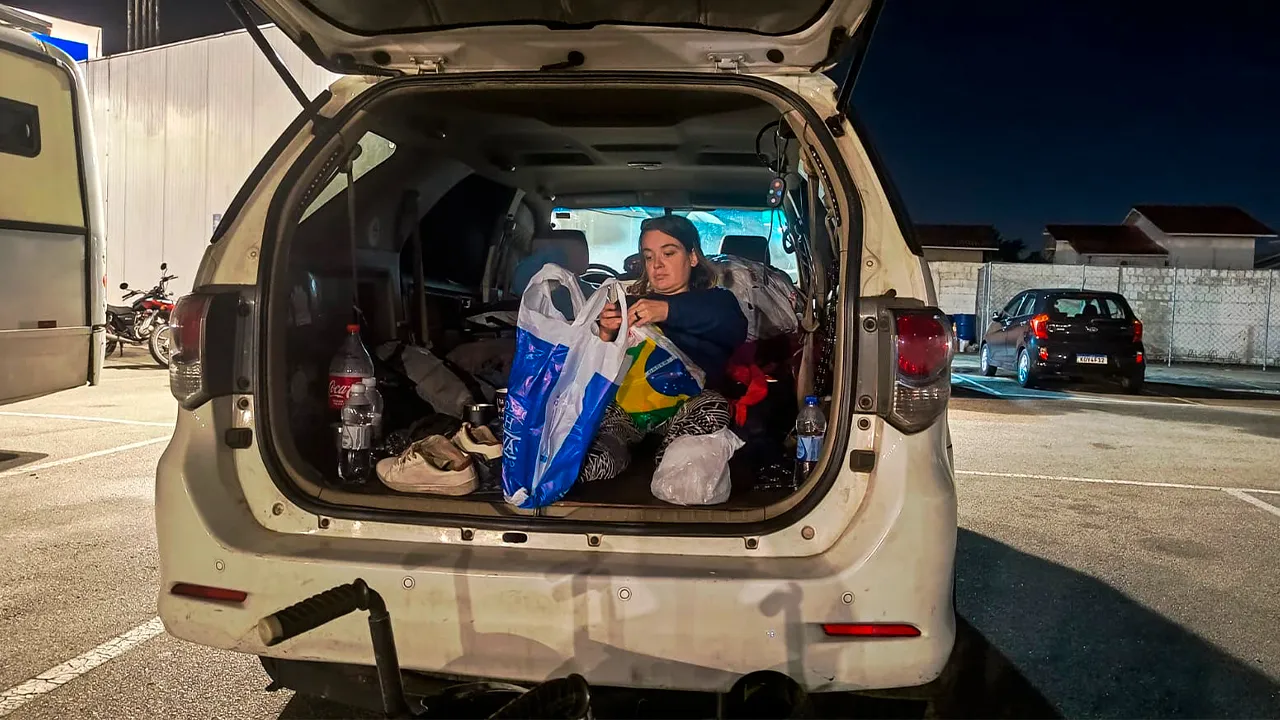 Depois de tudo lavado, voltamos para o posto de gasolina onde estamos dormindo. E a Sthefanie? Continua com aquele soninho de quem ainda não se recuperou da noite passada… 💤