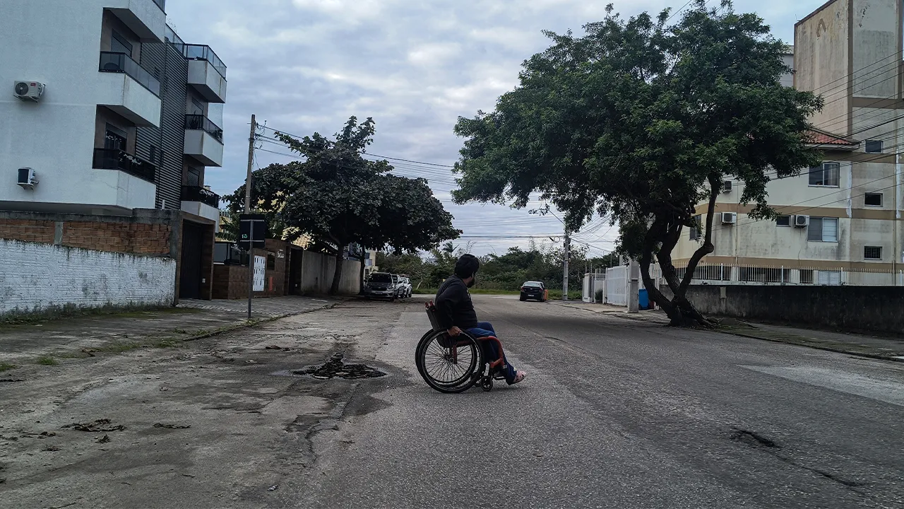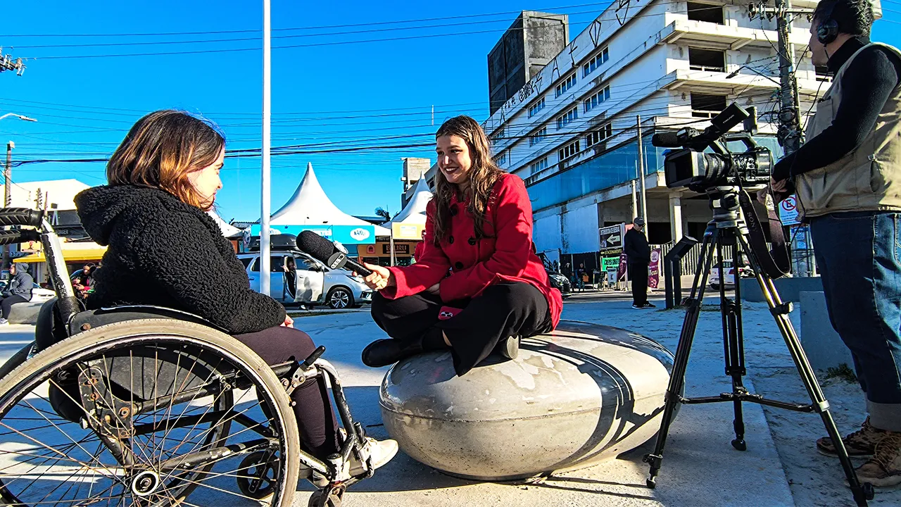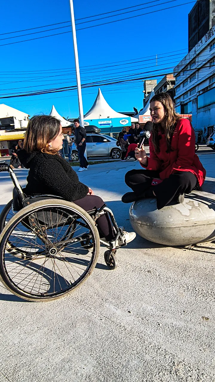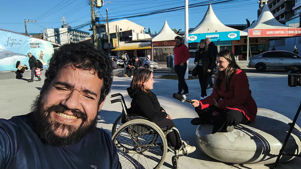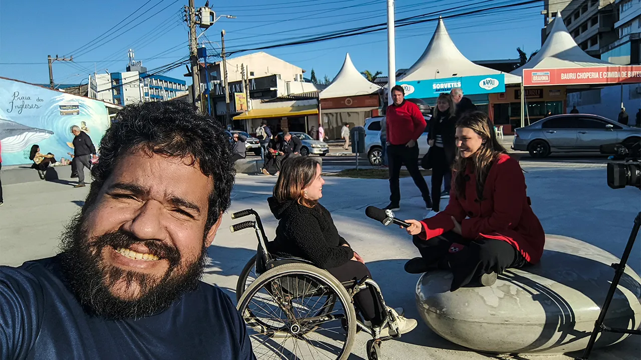 Antes da entrevista, tivemos o prazer de conhecer o Emerson, que também é PCD. Ele nos levou até uma padaria para tomar café da manhã, mas infelizmente a área da lanchonete não era acessível para cadeiras de rodas. Esperamos enquanto ele tomava seu café, e depois seguimos juntos até um hotel com uma vista maravilhosa para o mar — uma pausa revigorante antes do compromisso.