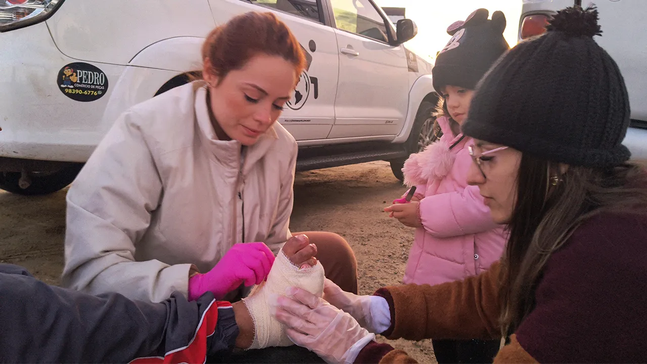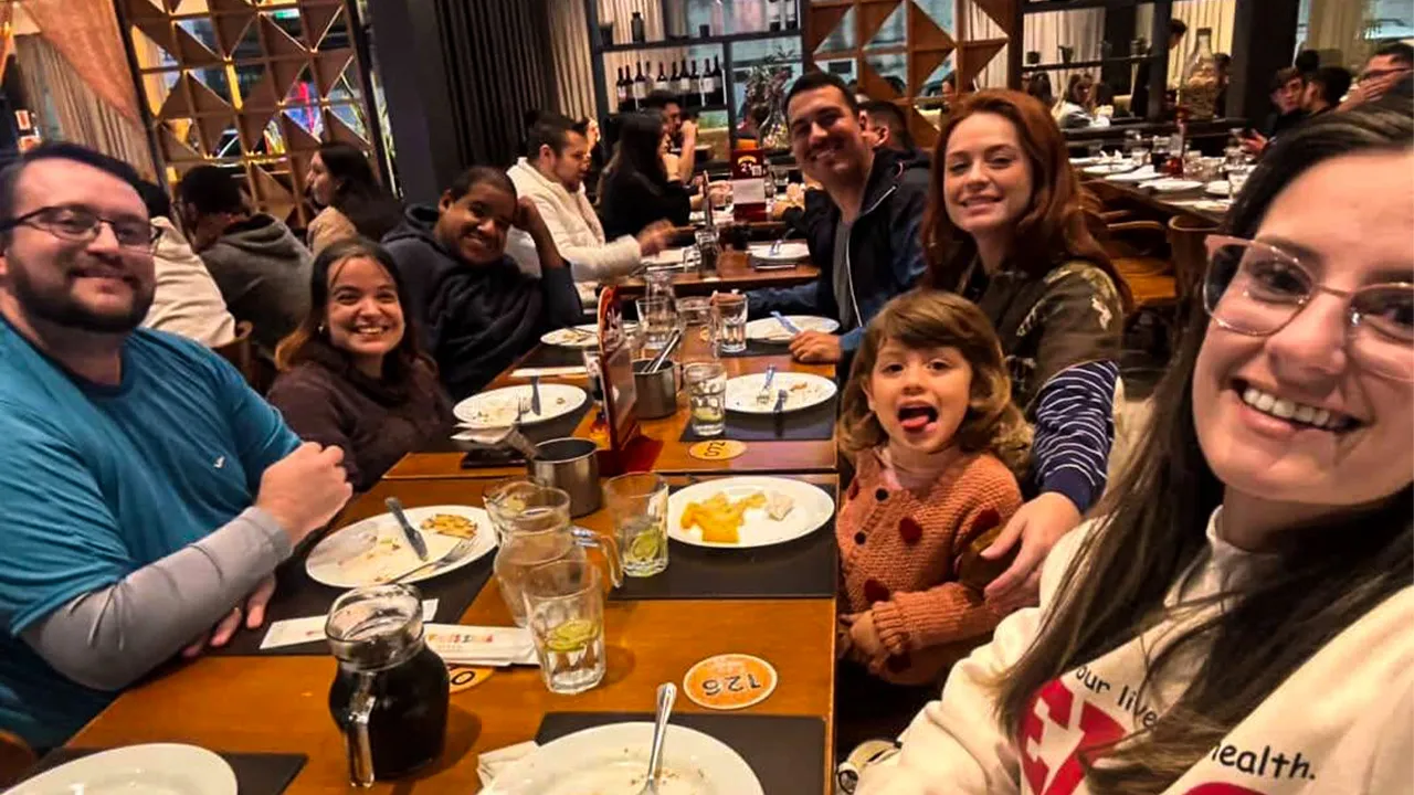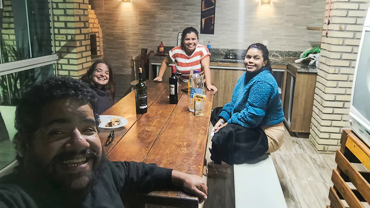 Depois da entrevista, voltamos para a pousada para aproveitar o friozinho e descansar… mas logo a Brenda e a Adriana chegaram e nos convidaram para um churrasco. Claro que topamos! Foi um momento gostoso, com risadas e bons papos. Durante o churrasco, a Sthéfanie bebeu um pouco do vinho que já estava acostumada a tomar — mas como estava há algum tempo sem beber, o efeito foi mais forte do que o esperado.