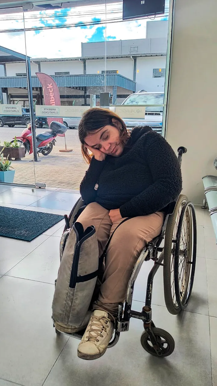 Mais tarde, pedimos um almoço que chegou com uma mensagem inspiradora — daquelas que fazem a gente refletir e sorrir ao mesmo tempo. Depois de comer, saímos para dar uma volta de cadeira de rodas pela cidade e acabamos encontrando uma loja especializada. Sthefanie, como sempre tentando abrir portas, propôs uma parceria… mas infelizmente, dessa vez, não rolou. Faz parte, né?