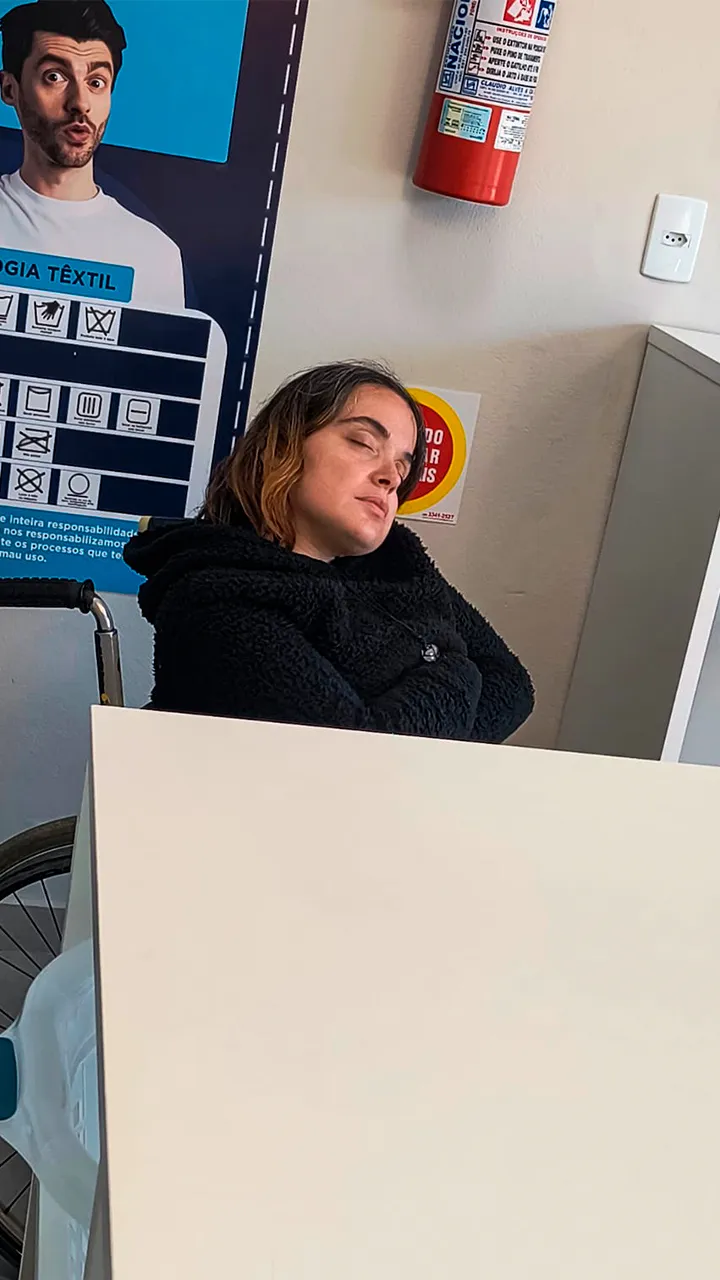 A Sthefanie até dormiu bem, mas acordou daquele jeitinho… com uma baita ressaca e tanto sono que parecia que nem tinha pregado o olho à noite kkk. Quando chegamos na lavanderia, já demos de cara com um degrau logo na entrada — e como já estávamos ali, ajudei ela a subir.