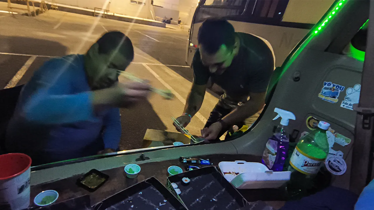 À noite, Letícia e Wiliam chegaram e trouxeram ainda mais calor humano para esse friozão. Juntos, fizemos uma mini fogueira que aqueceu não só o corpo, mas também o coração. Entre boas conversas e risadas, pedimos esfihas que deram um toque especial na noite. Mesmo com o vento gelado lá fora, o clima entre nós estava cheio de aconchego e boas energias. Dias simples assim são os que mais aquecem a alma.