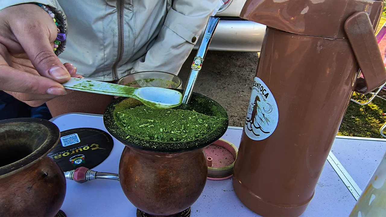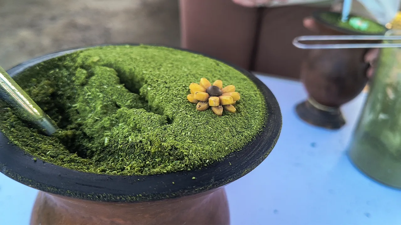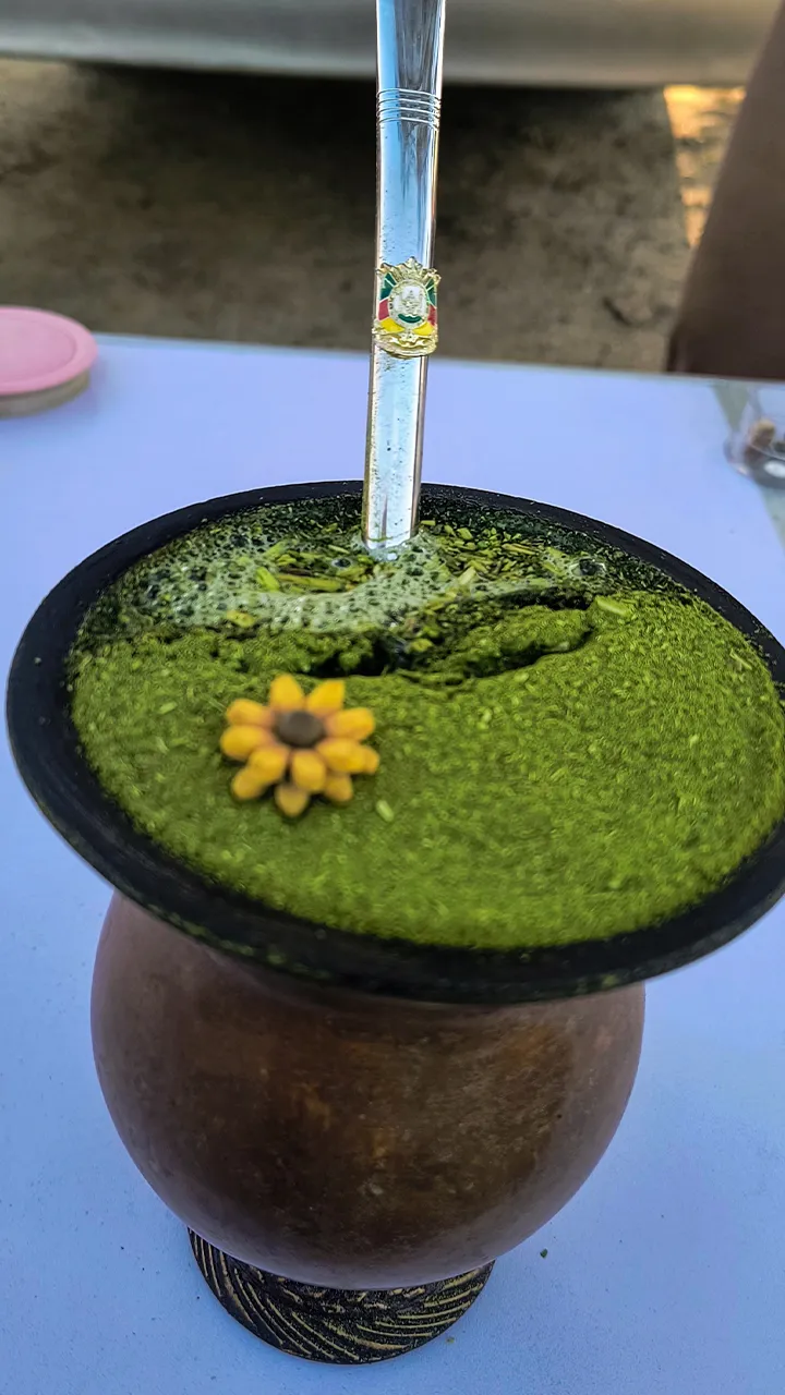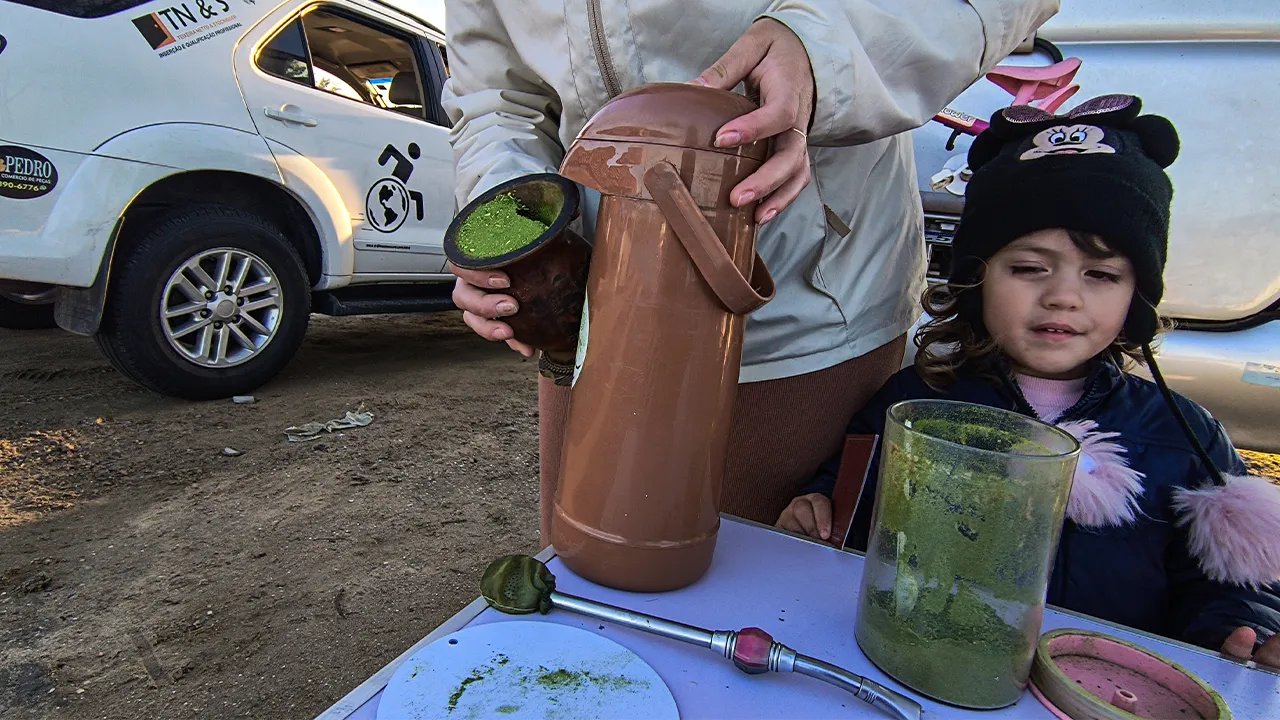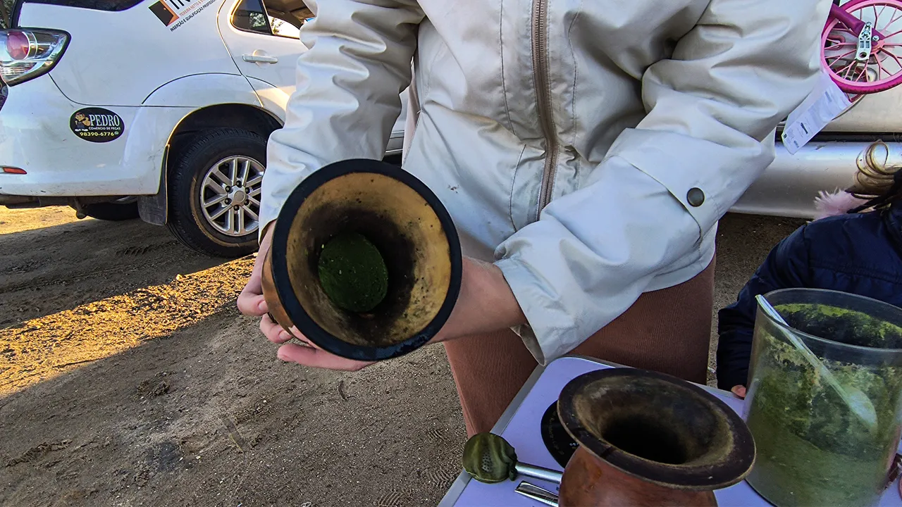 Depois de um almoço delicioso, os meninos voltaram à pescaria (ainda na esperança de fisgar alguma coisa), e eu fiquei com a Raquel, que me ensinou a preparar um chimarrão com todo o cuidado e carinho — ficou lindo! E vamos combinar: nada melhor que um chimarrão bem-feito para aquecer esse friozinho, porque o sol até aparece, mas não esquenta nadinha kkkk.