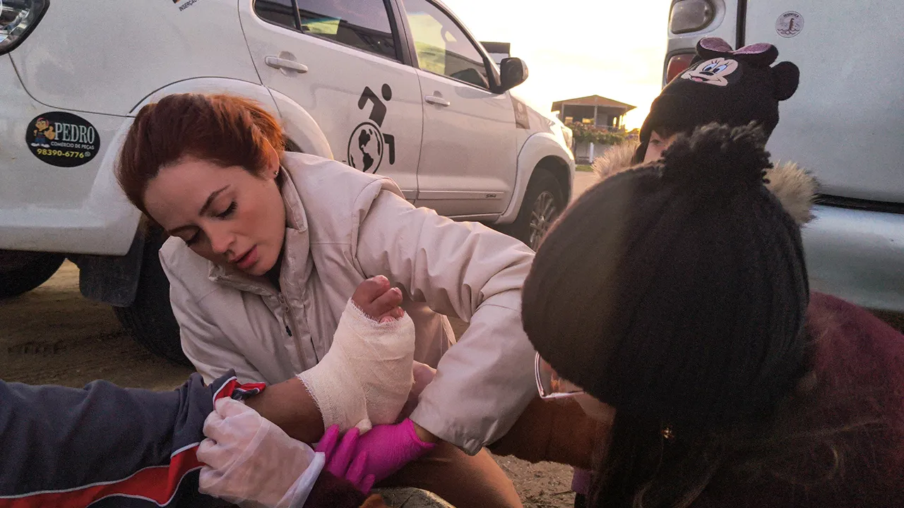Mais tarde, Raquel e Letícia cuidaram do pé do John, fazendo um curativo com toda atenção. Como a pescaria não rendeu nenhum peixe, a galera teve uma ideia ainda melhor: ir até a pizzaria que fica do lado do ponto de apoio onde estamos dormindo. E que escolha maravilhosa! As pizzas estavam incríveis — e o mais engraçado é que eu e a Raquel temos exatamente os mesmos gostos, rimos muito disso kkkk.