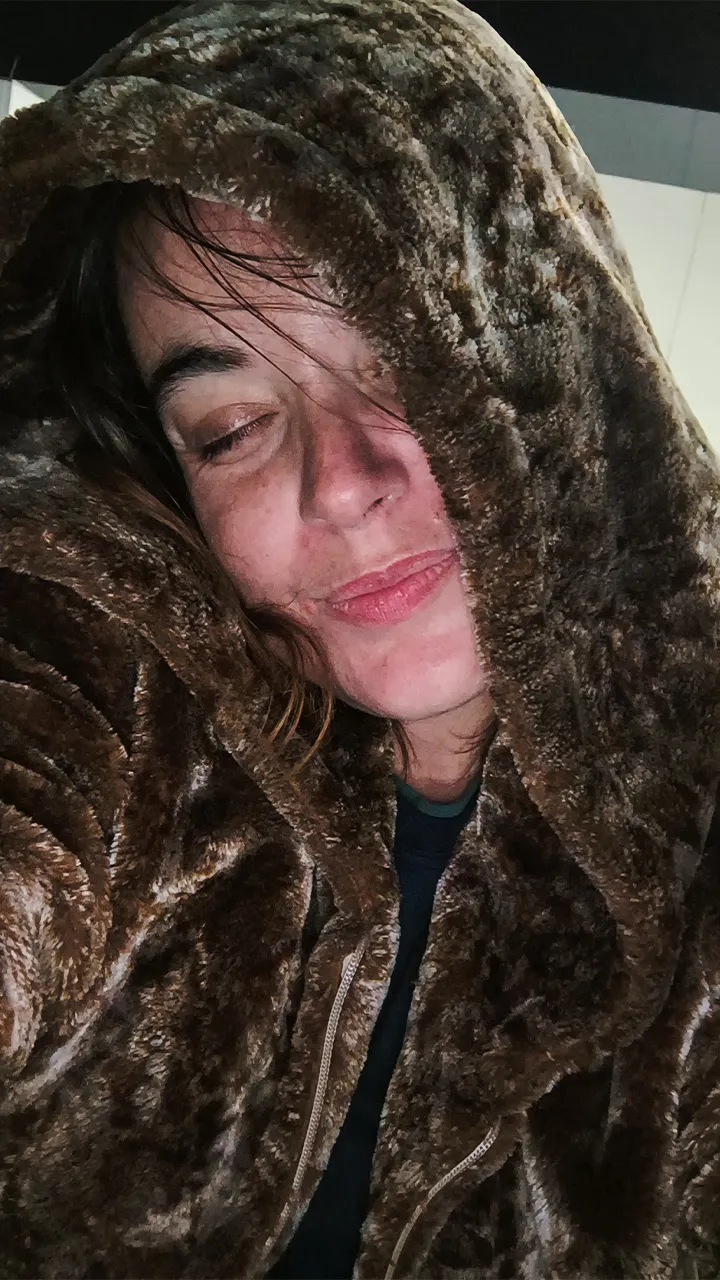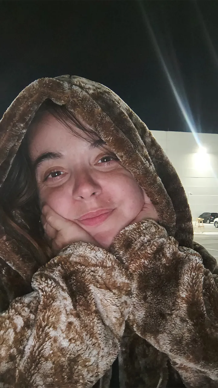 À noite, com o frio cortando até a alma, a Raquel me emprestou sua blusa de frio — e que blusa! Me senti simplesmente poderosa com ela, tão linda que até resolvi tirar algumas fotos. Era assim que eu imaginava me sentindo no frio: estilosa, aquecida e cheia de atitude! Kkkk