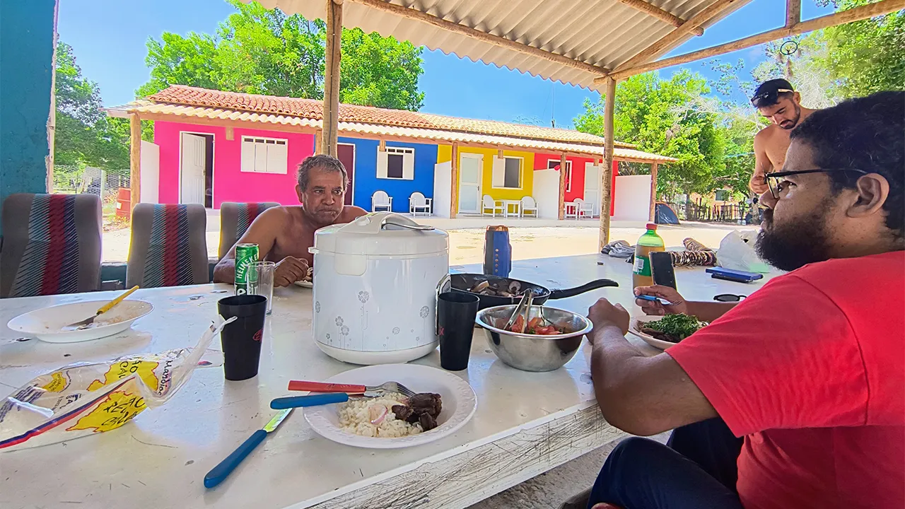Ao meio-dia, o Sr. Santinho, dono do camping, preparou um almoço delicioso e nos convidou para comer com ele. Foi um momento simples, mas muito agradável, onde pudemos aproveitar a hospitalidade e a boa comida.
