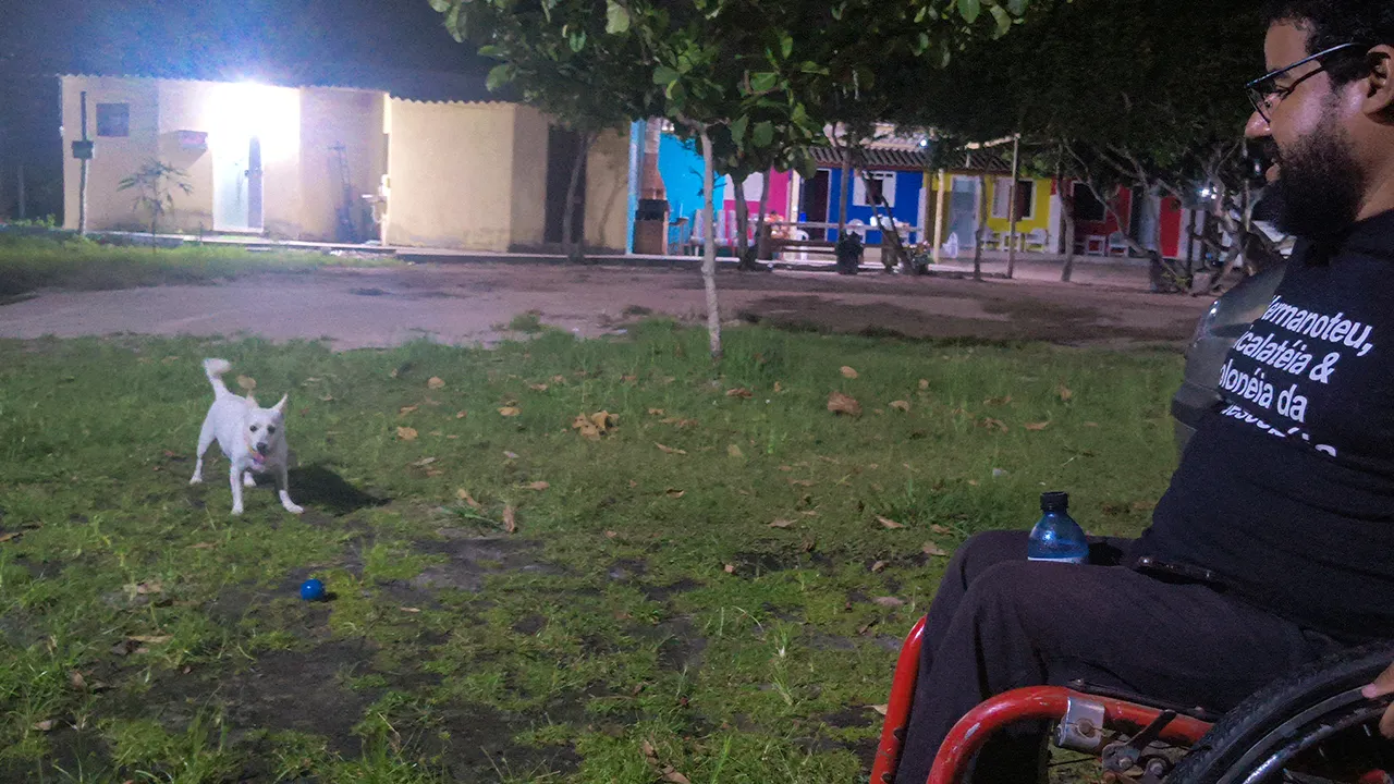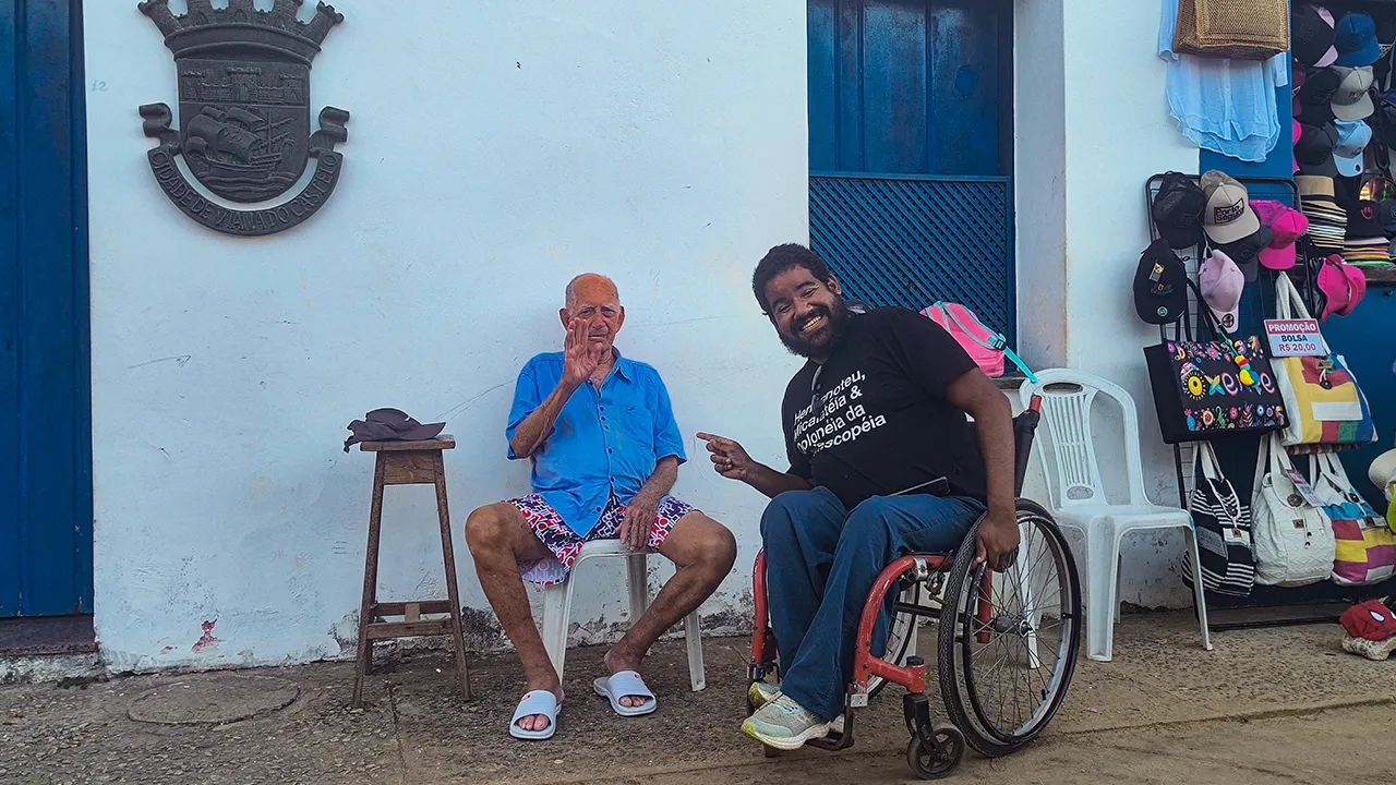De lá, seguimos para o centro histórico de Porto Seguro, um local cheio de história, mas que também deixa muito a desejar quando o assunto é acessibilidade – praticamente 100% precisa ser repensado. Durante a visita, conhecemos um morador que nasceu e cresceu na vila, ainda morando por lá, além de um senhor de 98 anos que impressionou o John com sua vitalidade e disposição.