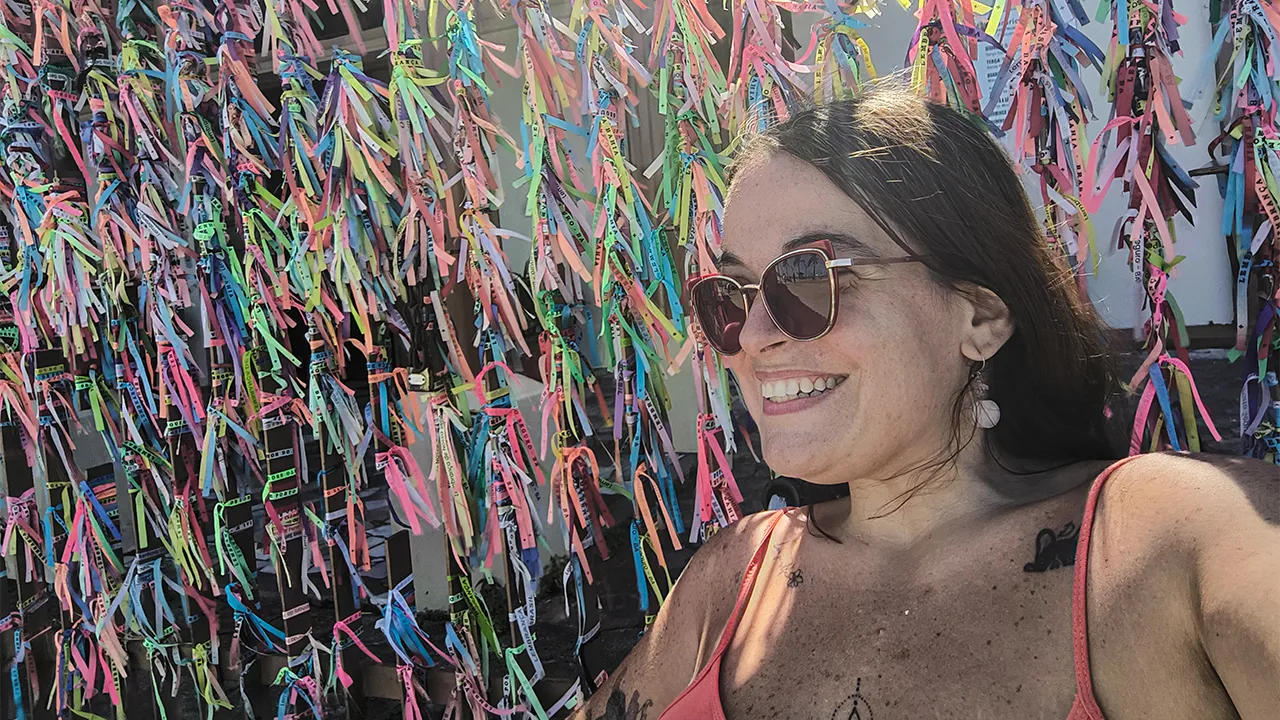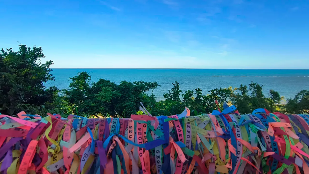 No local, amarramos nossa fitinha na grade para deixar nossa marca, experimentamos diversos tipos de cocada e eu ainda provei algumas cachaças e chocolates deliciosos. Um detalhe curioso foi descobrir uma barraca de acarajé com o mesmo sobrenome que o meu, Déa, o que deixou a experiência ainda mais especial.