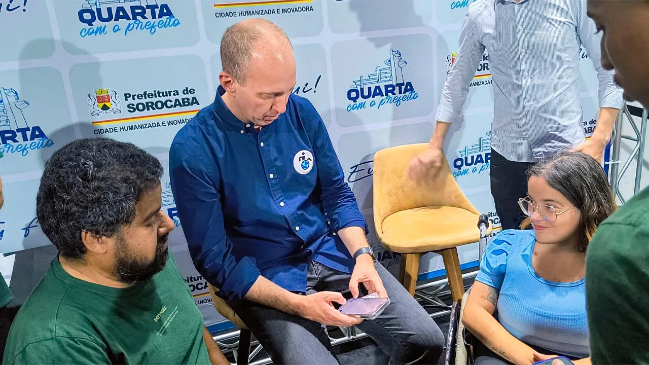 Quando chegou o momento de conversar com o prefeito, fomos recebidos com muita simpatia. Ele colou nosso adesivo no peito e ainda pediu para que o assessor nos levasse a conhecer a famosa “melhor coxinha do Brasil”. Fomos até a lanchonete e, de fato, a coxinha fez jus à fama — deliciosa! Aproveitamos para bater um bom papo com o assessor, já que o prefeito não pôde nos acompanhar.