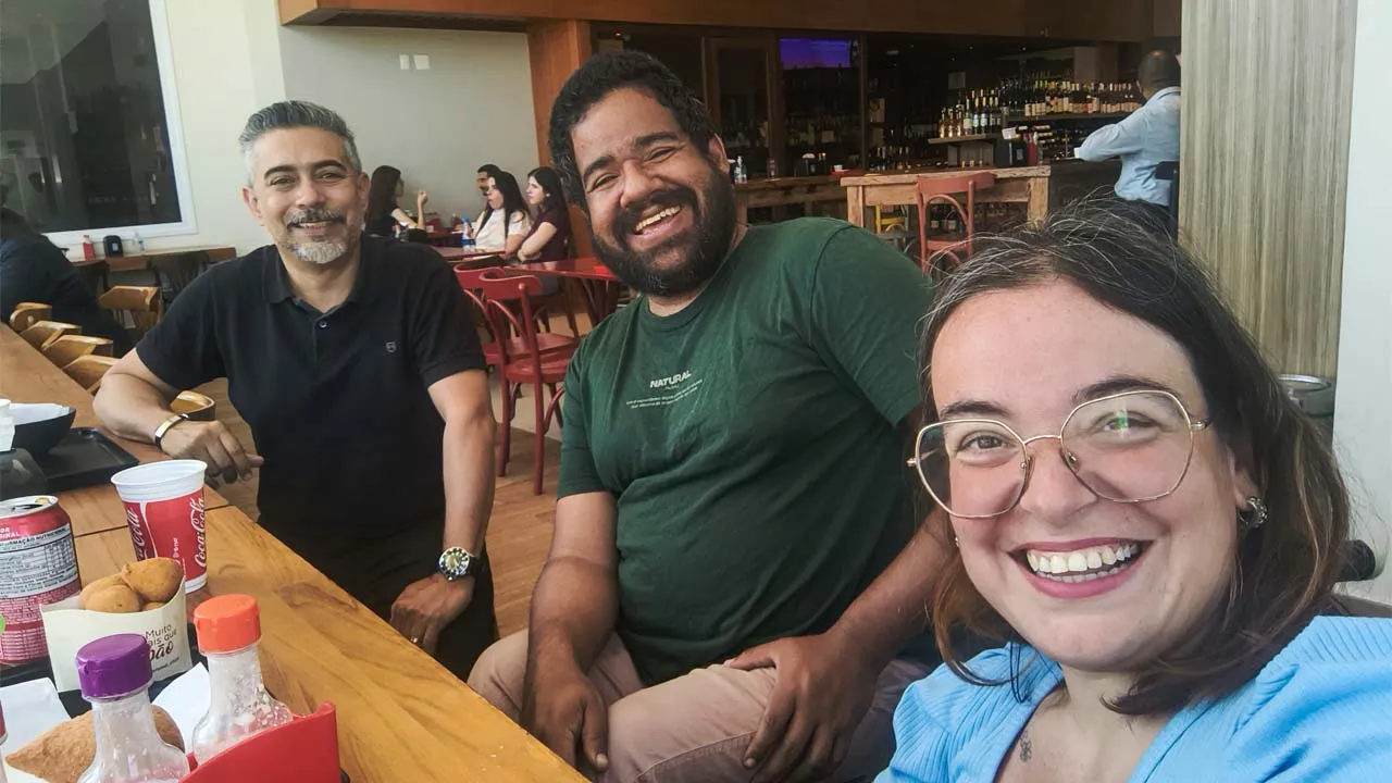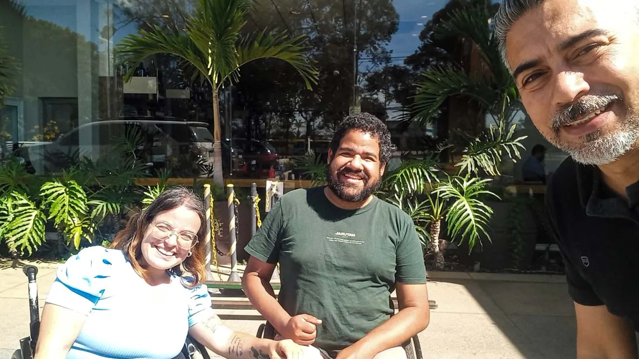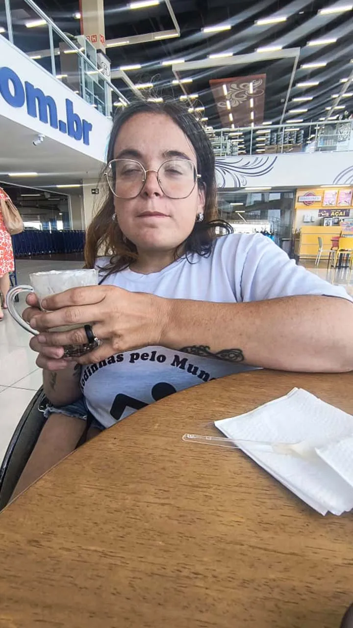 O dia continuou agradável. Depois de nos despedirmos, fomos ao shopping e, para nossa surpresa, encontramos a Mari novamente. Ela nos presenteou com seu livro, um gesto cheio de carinho. A mãe dela também nos indicou experimentar a esfiha de queijo gorgonzola com cebola caramelizada — e que escolha maravilhosa! Mari, que convive com paralisia cerebral, tem uma relação linda e inspiradora com sua mãe, e foi muito bonito ver como as duas se entendem tão bem.