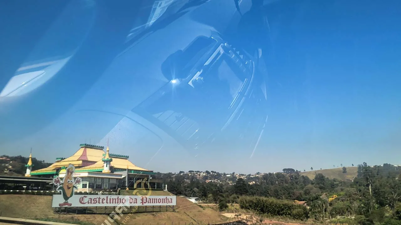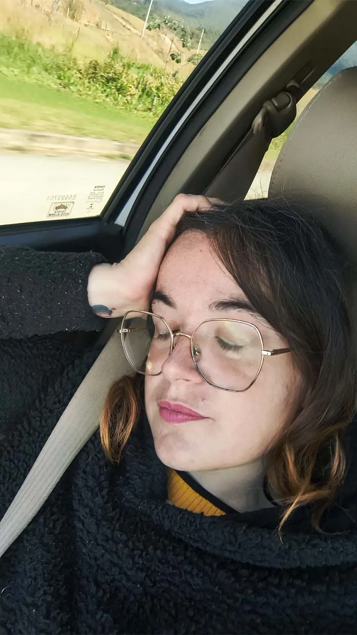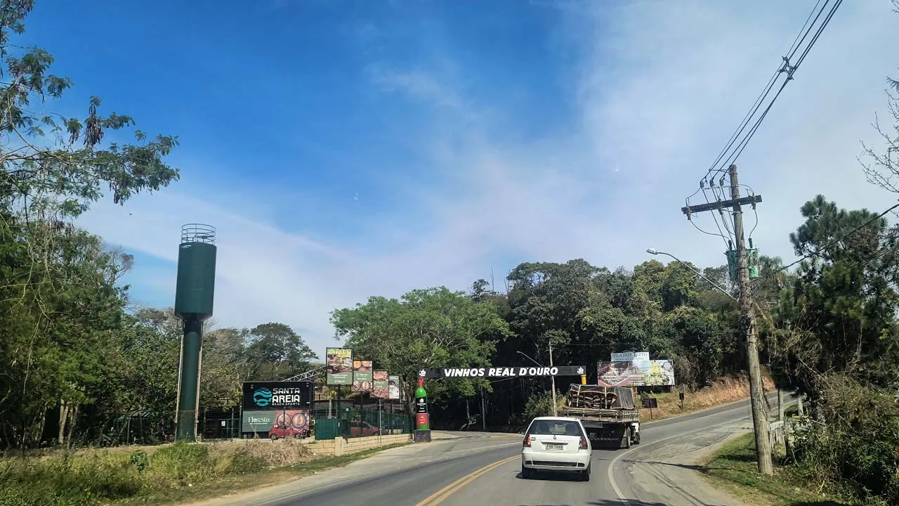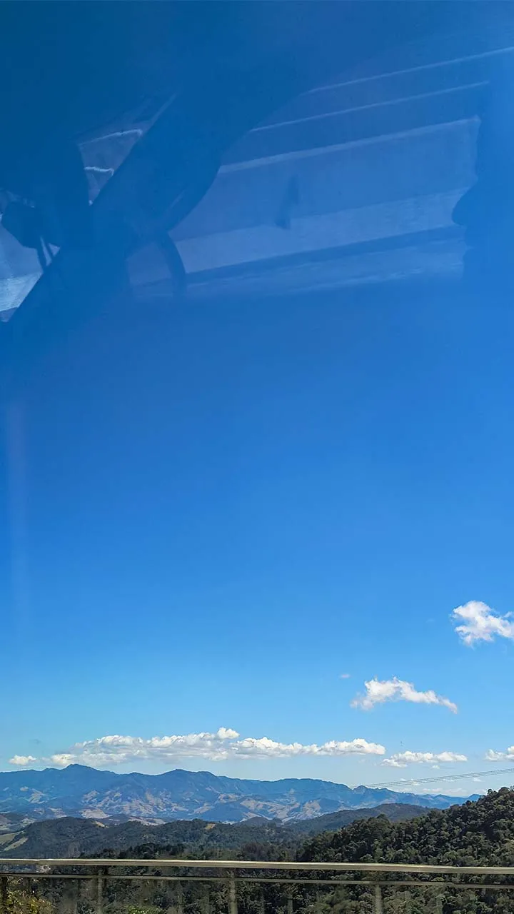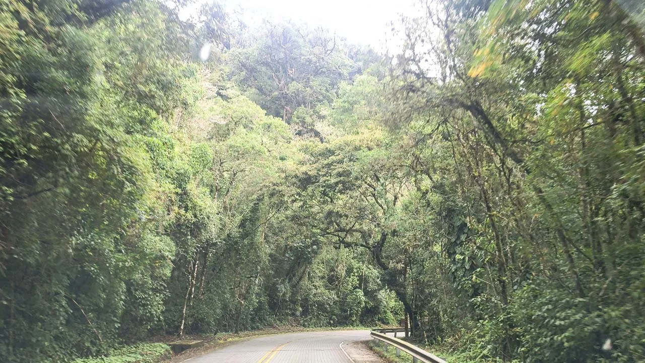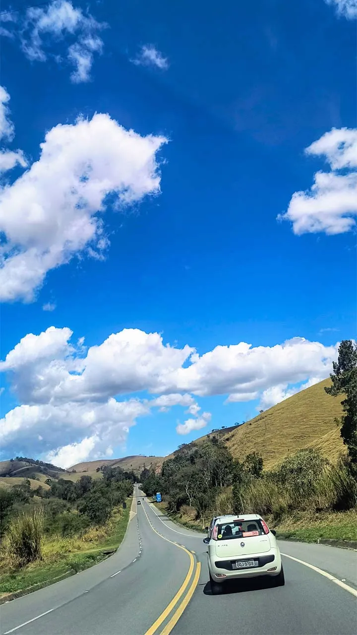 Pegamos estrada e enfrentamos muitas curvas no sobe e desce da serra — e nessas horas a Sthefanie sempre sofre um pouco, já que o estômago não gosta nada desse balançar.