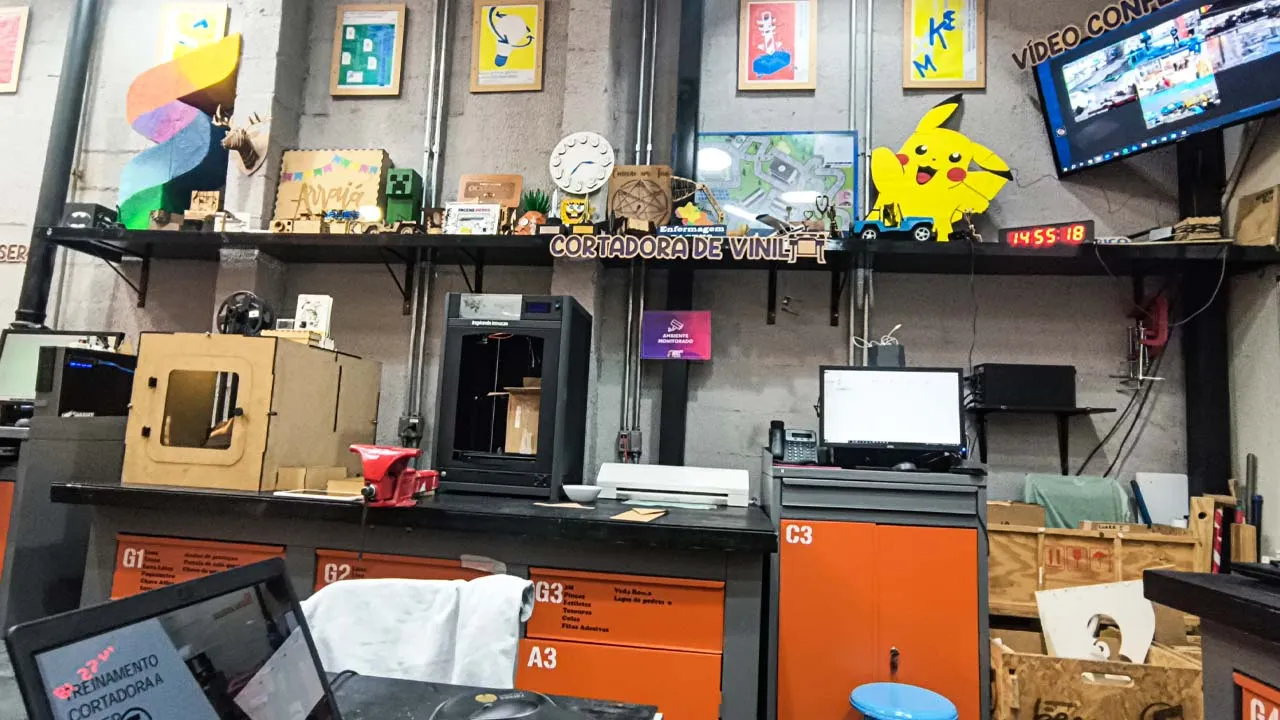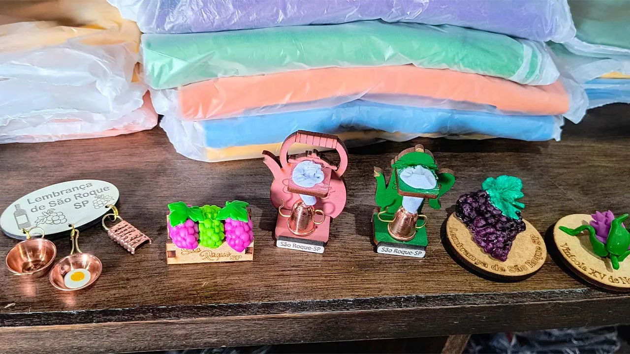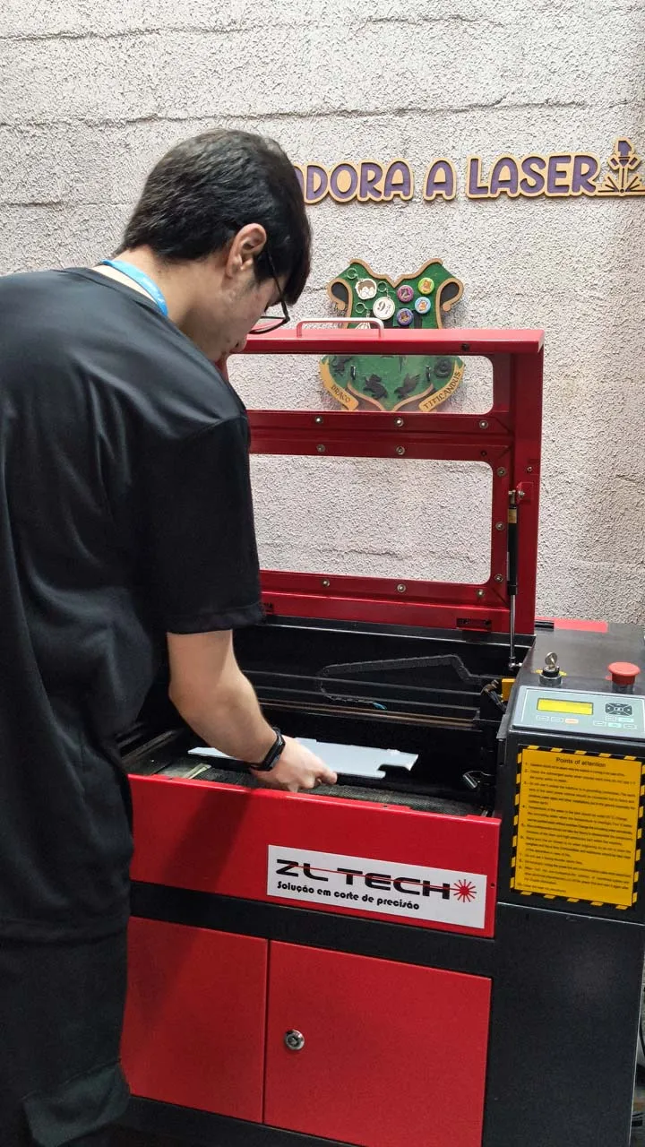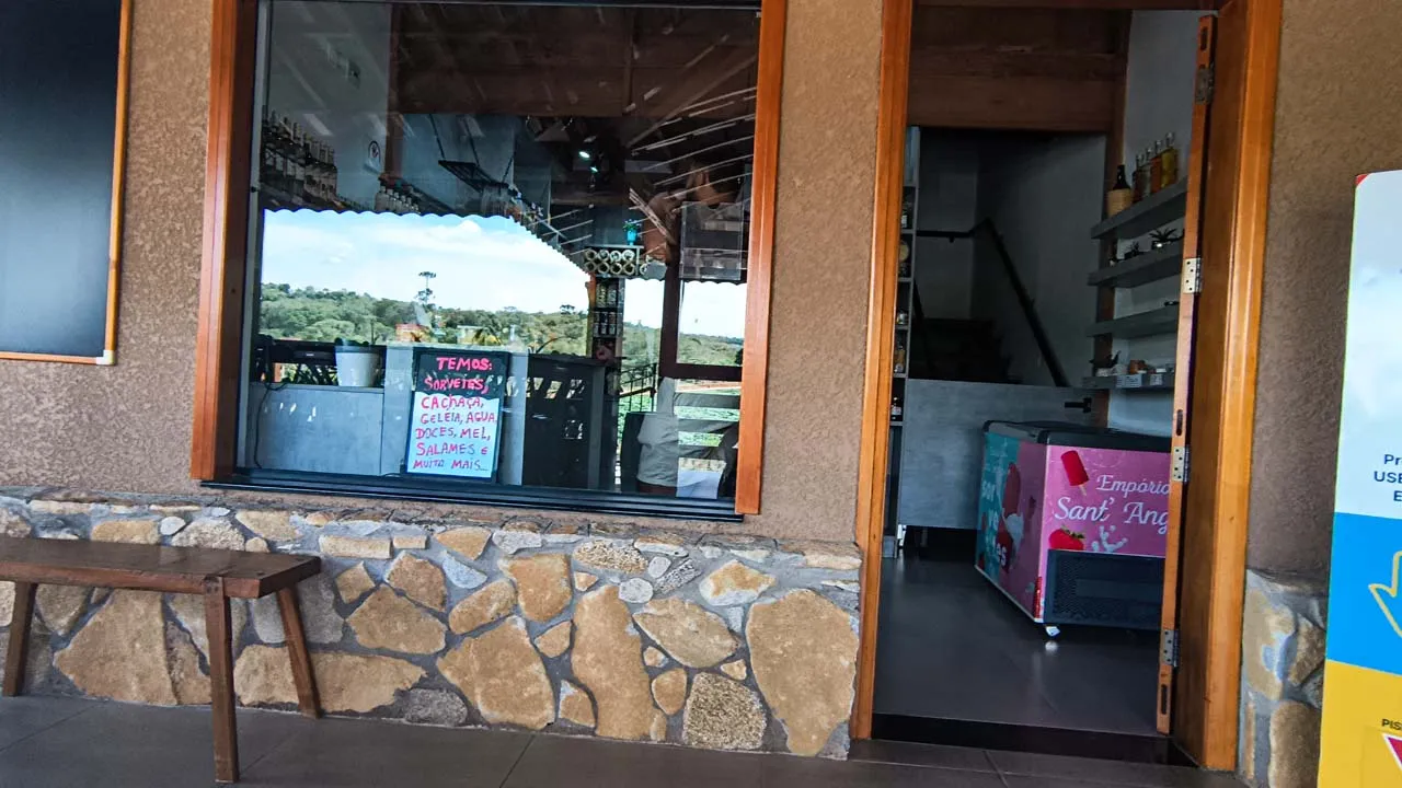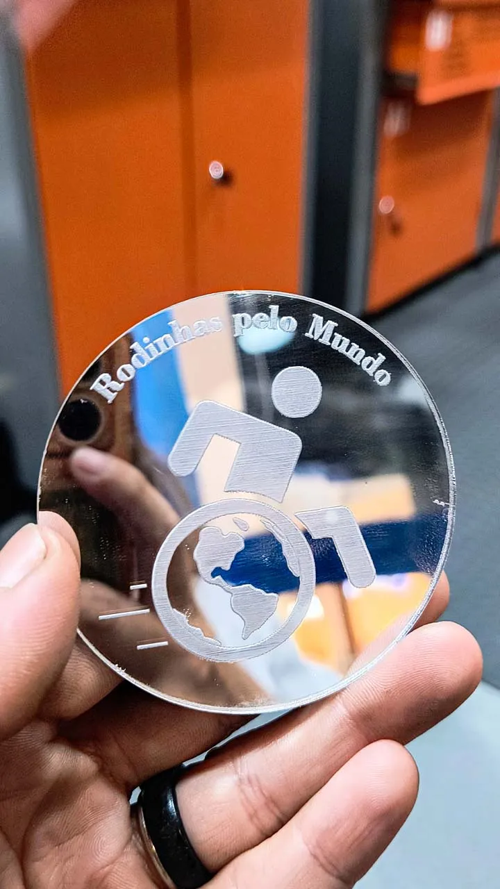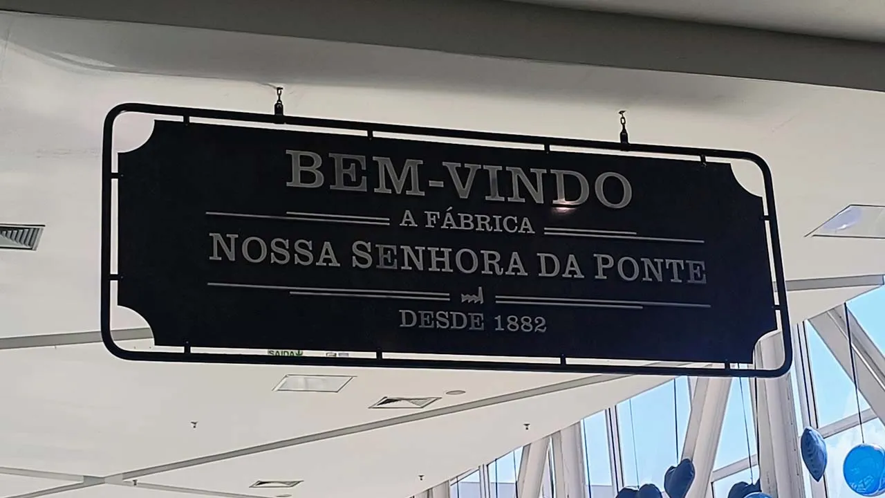 No passeio, demos uma volta no shopping que, na verdade, tem uma história bem especial: antigamente era a Fábrica Nossa Senhora da Ponte, e até hoje mantém sua estrutura original, o que dá um charme todo diferente ao lugar. Dentro dele conhecemos uma mini fábrica bem legal que faz cortes a laser em vidro, madeira e muito mais. Não resisti e pedi pra fazerem a nossa logo — ficou lindinha demais 🥰.