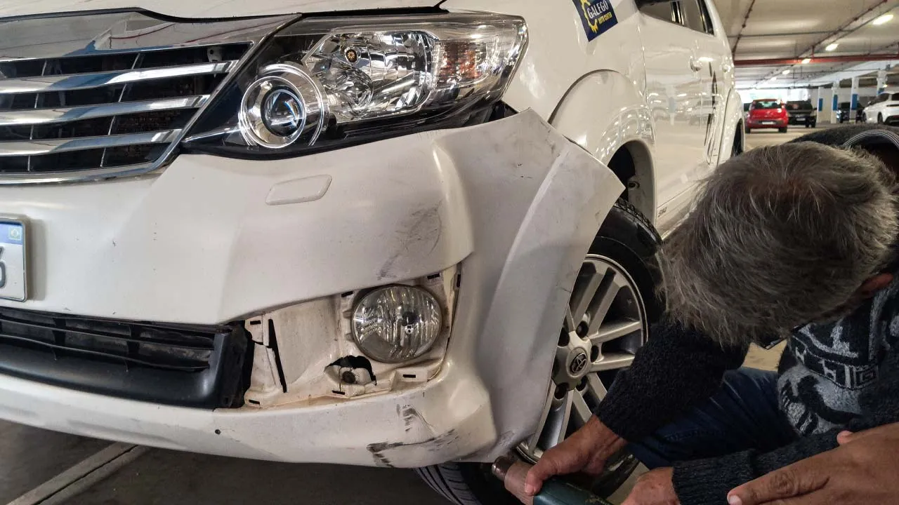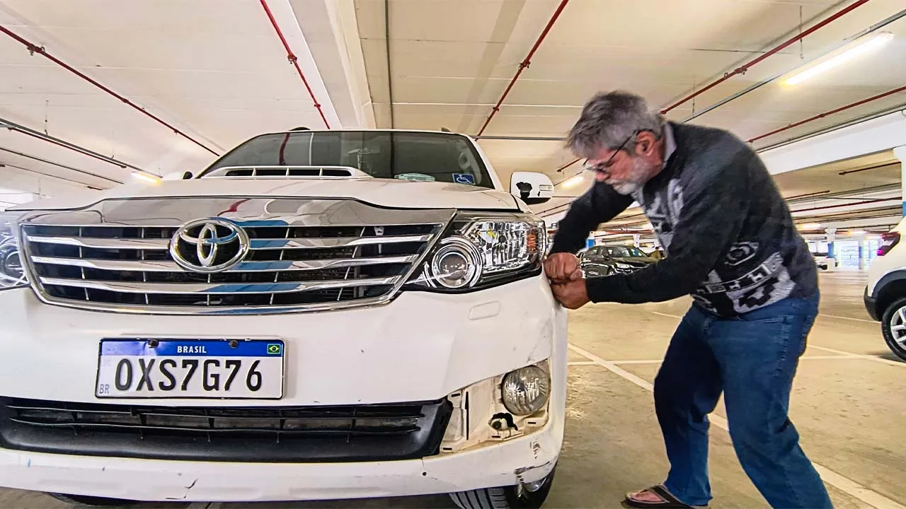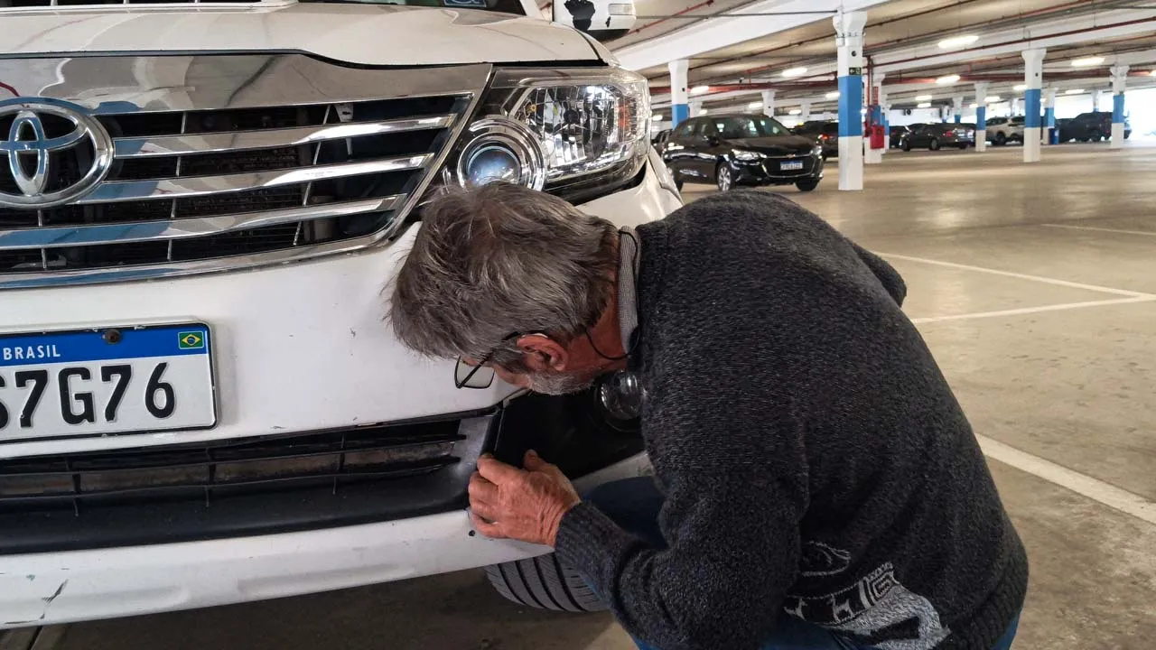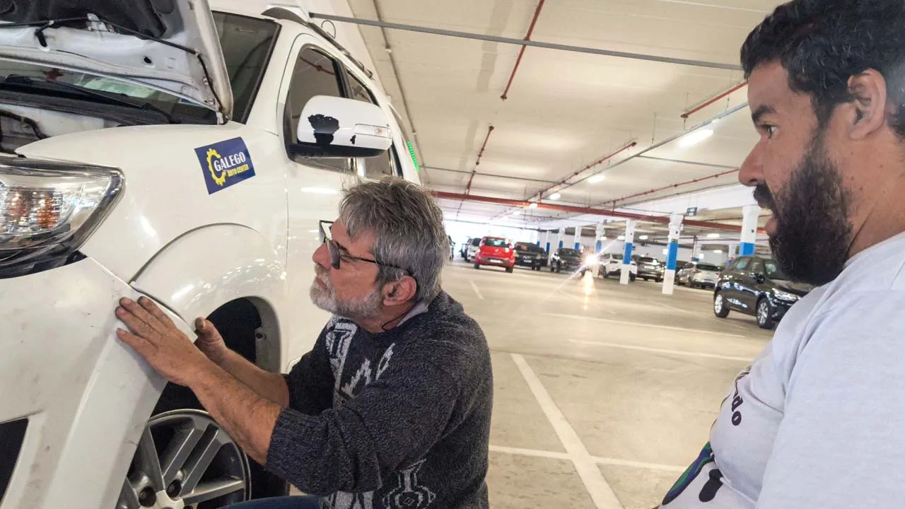 Ainda estamos chateados com a situação do carro, mas acreditamos que tudo vai se resolver. Voltamos para a Havan e acabamos conhecendo os donos de um motorhome muito simpáticos. O Gerson nos surpreendeu mostrando uma maquininha parecida com um secador, que consegue fazer o plástico voltar ao normal. Ele nos ajudou a dar uma melhorada na parte amassada, mas mesmo assim será necessário levar o carro na lanternagem, já que a parte do farol ficou funda e o para-choque não está fixando.