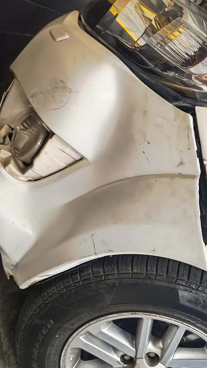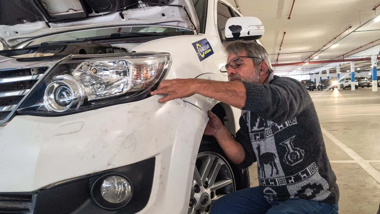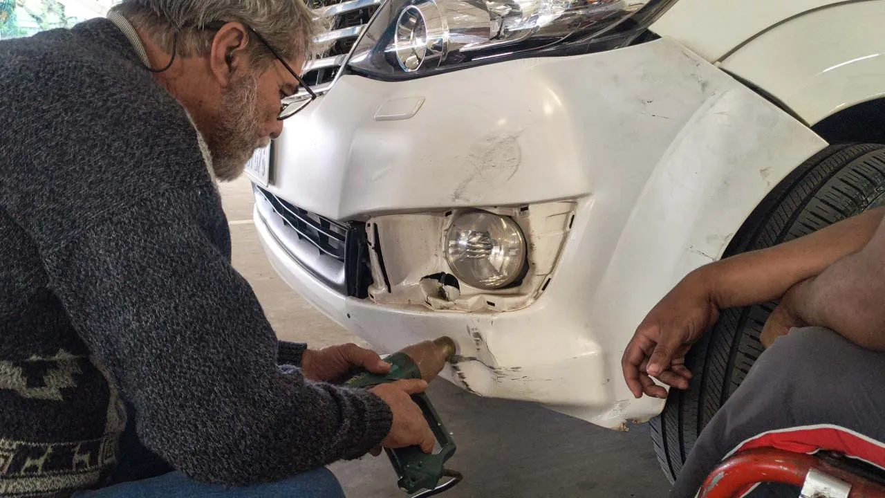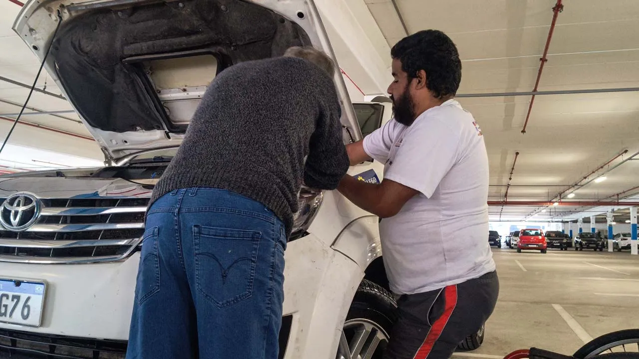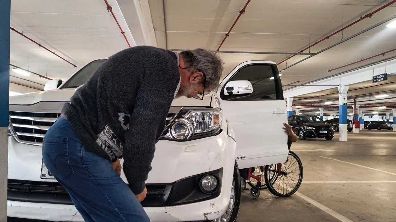 Ainda estamos chateados com a situação do carro, mas acreditamos que tudo vai se resolver. Voltamos para a Havan e acabamos conhecendo os donos de um motorhome muito simpáticos. O Gerson nos surpreendeu mostrando uma maquininha parecida com um secador, que consegue fazer o plástico voltar ao normal. Ele nos ajudou a dar uma melhorada na parte amassada, mas mesmo assim será necessário levar o carro na lanternagem, já que a parte do farol ficou funda e o para-choque não está fixando.