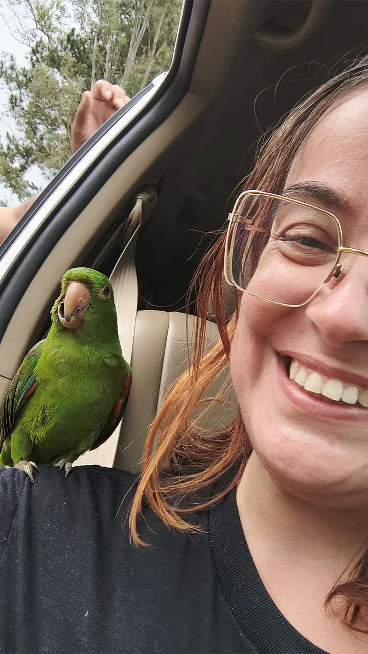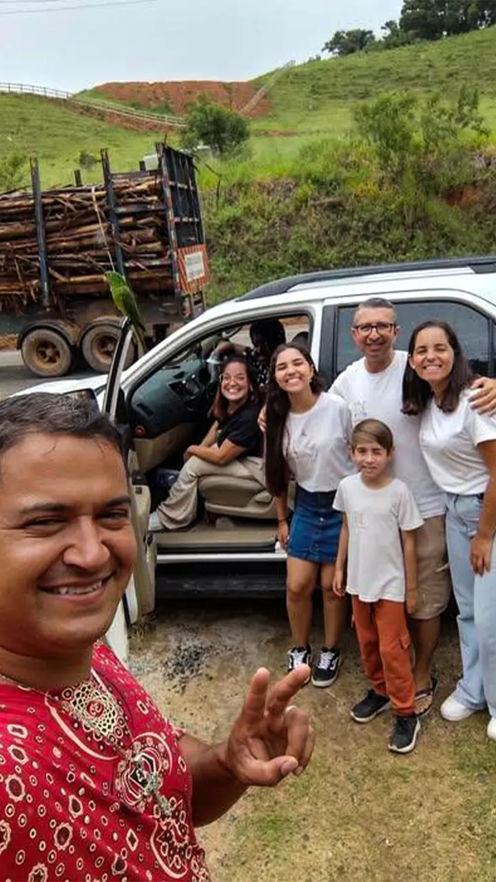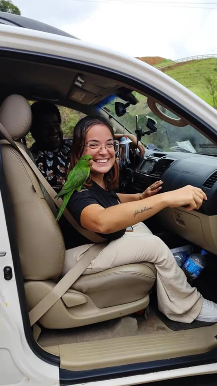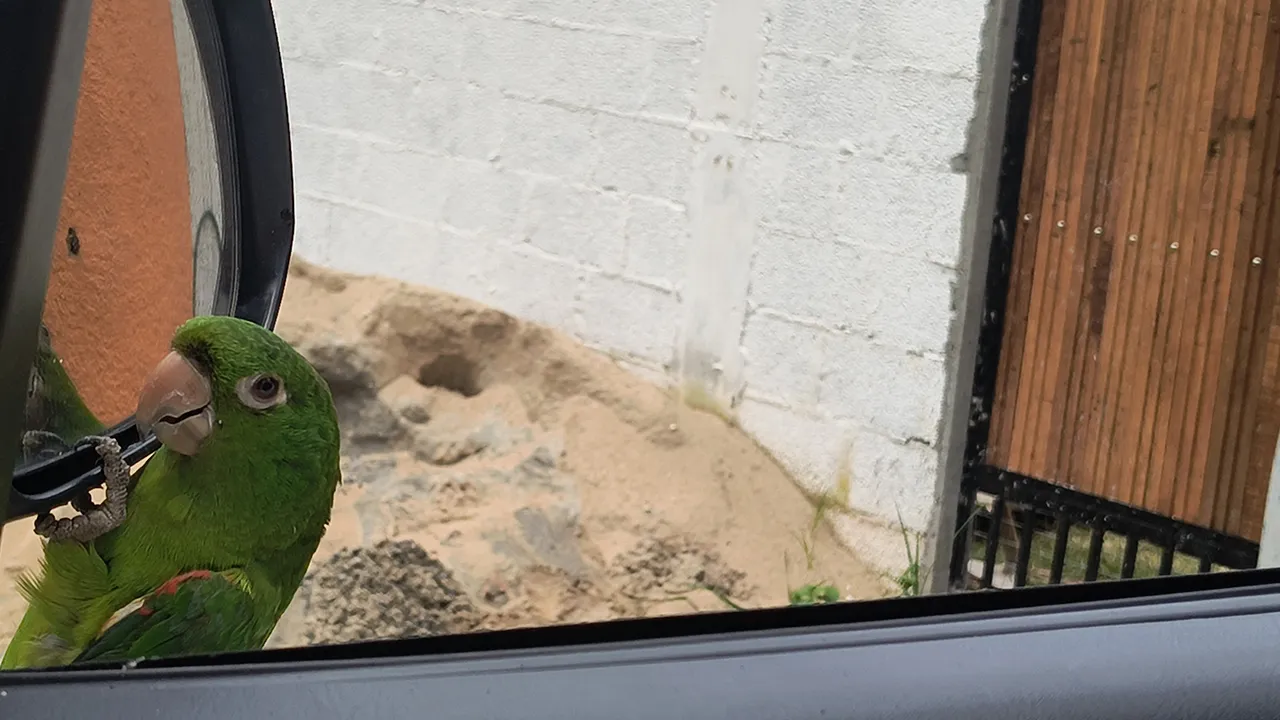 Passamos um tempo descontraído, brincando com os cachorrinhos e interagindo com uma maritaca, que veio até mim e não queria sair do meu ombro. Brinquei com o Guto, dizendo que ia levar a maritaca embora com a gente, o que o deixou “apavorado” (no bom humor da situação, claro). Ele riu, mas logo pegou a maritaca de volta.