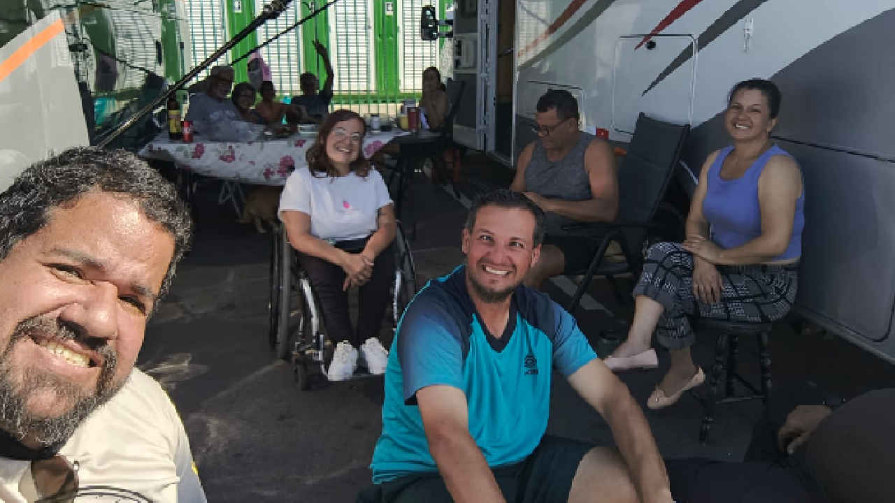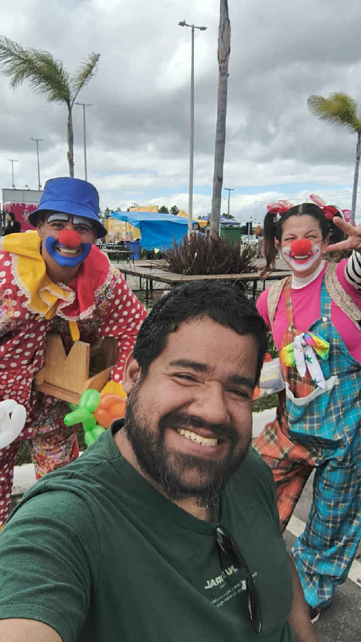 Logo depois, fomos conhecer nossos novos vizinhos — porque vida de viajante é assim, cada parada traz novas pessoas, novas histórias e novos sorrisos. Entre um papo e outro, John já se enturmou e acabou tirando uma foto hilária com o Neymar e a Cris… vestidos de palhaço! Foi impossível não rir dessa cena inesperada, do jeitinho que nossas viagens sempre surpreendem.