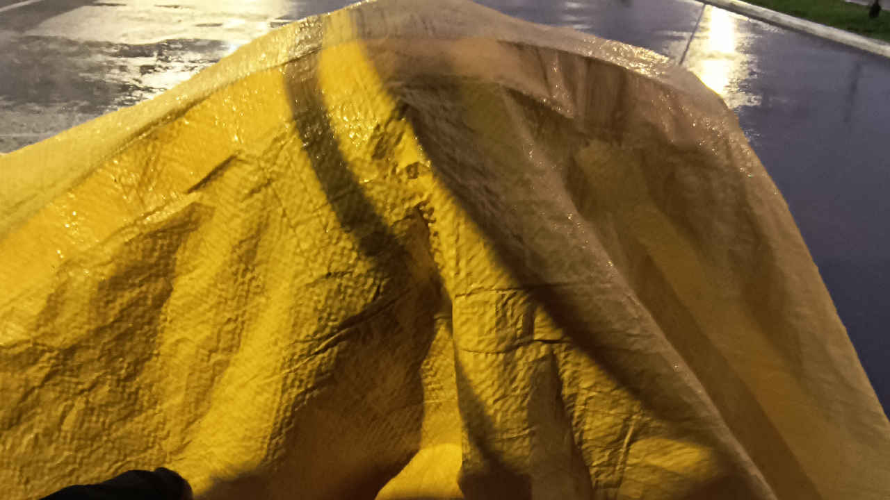 Quando finalmente deu uma trégua, saímos para conversar com alguns viajantes e colocar o papo em dia. Mas do nada o John avisou que a chuva estava voltando e pediu para entrarmos em casa. Eu consegui entrar a tempo, mas a chuva acabou pegando ele no meio do caminho. Corri para ajudar e conseguimos cobrir o meu bichinho com a lona. Agora é torcer para que essa chuva passe logo, para ele conseguir entrar quentinho e seco pra dentro de casa.