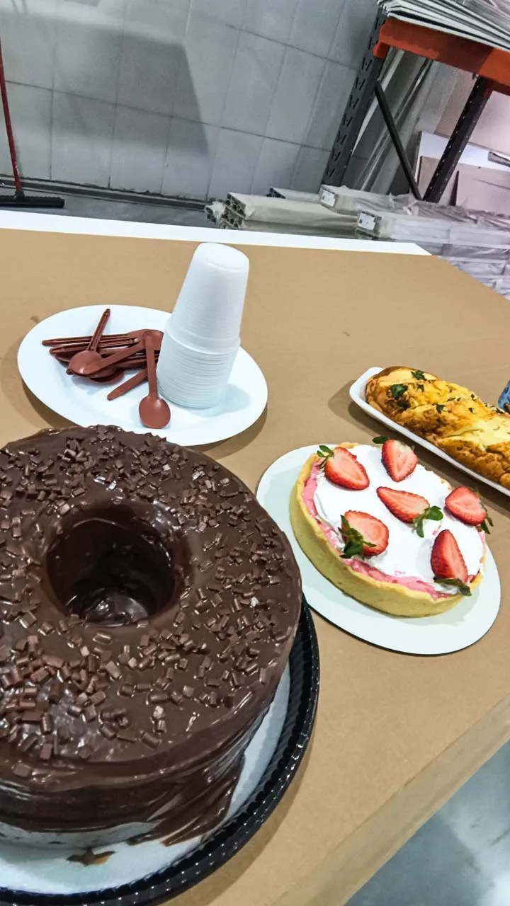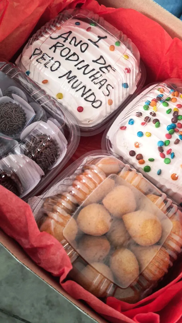 A Sthéfanie ficou em busca de contatos para compartilhar nossa história e, através disso, recebemos um presente super especial: a confeiteira Jack nos trouxe um almoço delicioso. Mas a generosidade dela não parou por aí… à tarde ainda nos surpreendeu com um kit festa maravilhoso para comemorarmos nosso primeiro ano na estrada 🚐🎉. Foi emocionante celebrar essa data com tanto carinho!
