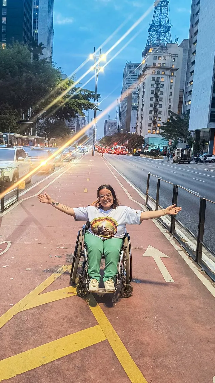 Foi um momento muito especial para a Sthéfanie, que já morou em São Paulo, mas nunca tinha passeado pela Paulista de cadeira de rodas — sempre passava de carro. Hoje, ela pôde viver a experiência de uma forma diferente, aproveitando cada detalhe, e ficou toda feliz.