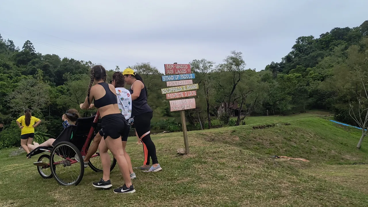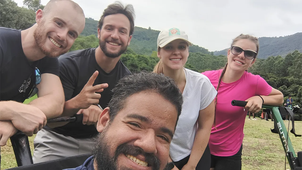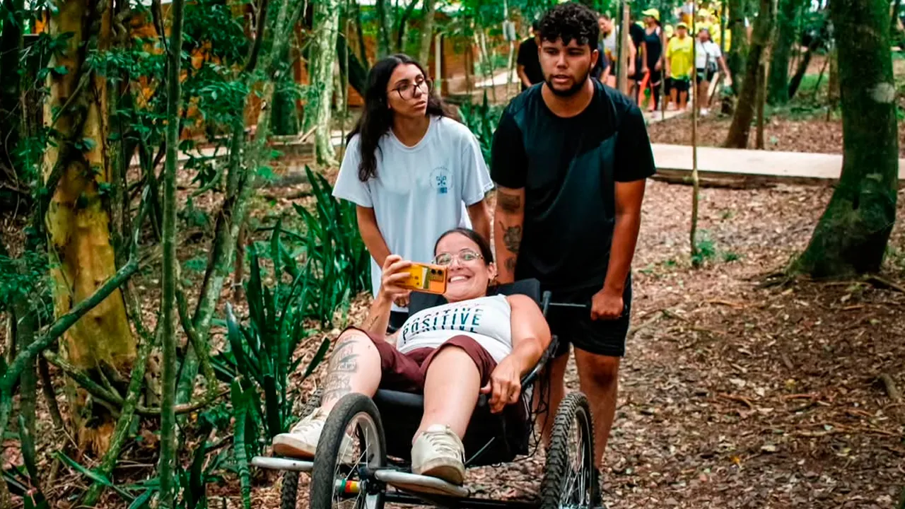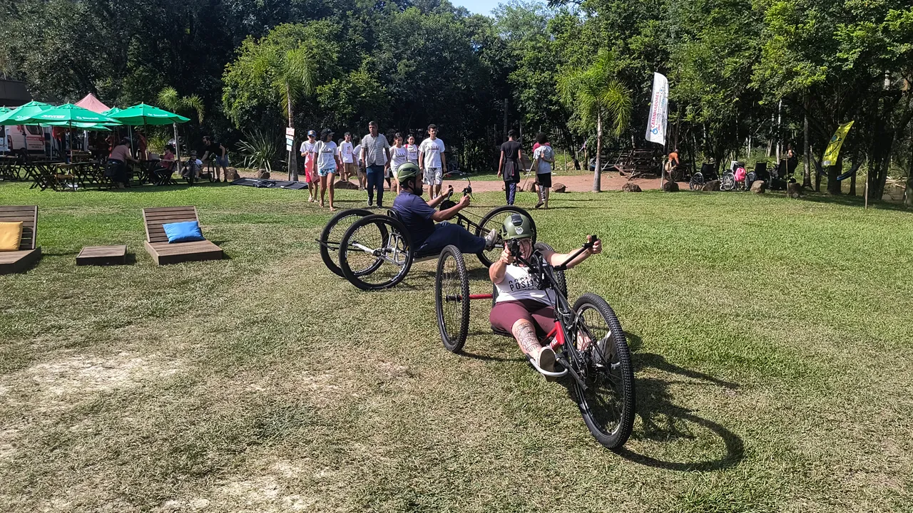Quando voltei, John me contou como foi a trilha dele e juntos fomos curtir mais um esporte: arco e flecha! Um momento de foco, respiração e risadas. Para fechar esse dia cheio de adrenalina e superações, encarei a trilha — mas dessa vez em uma cadeira de rodas especial, própria para esse tipo de terreno. Foi minha primeira vez utilizando essa cadeira e confesso que tive alguns momentos de tensão, mas fui com coragem e terminei com o coração leve.