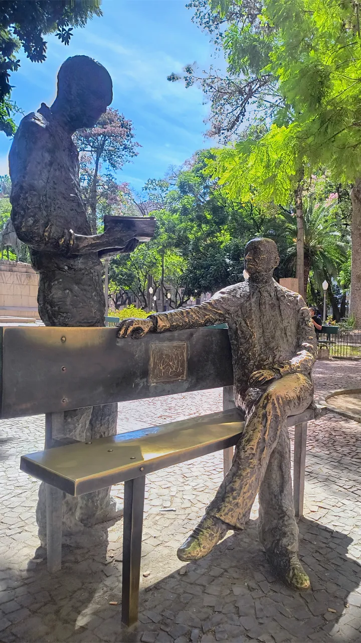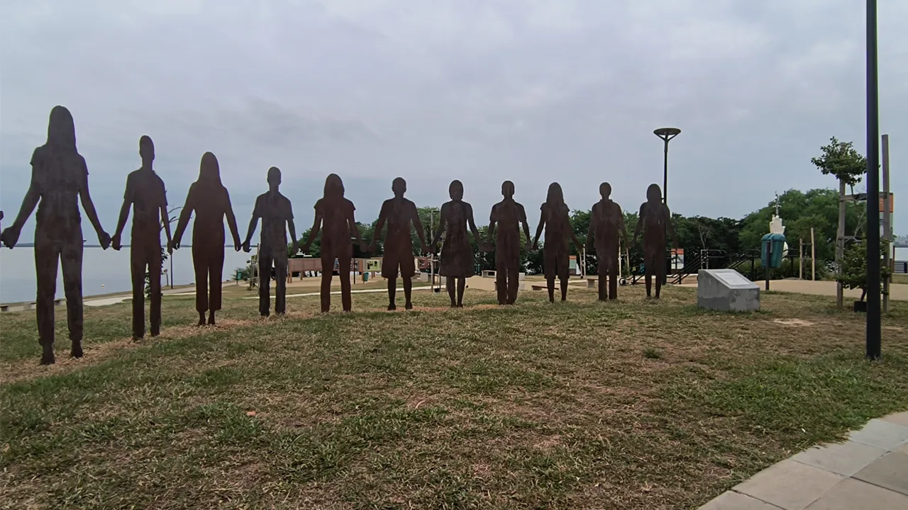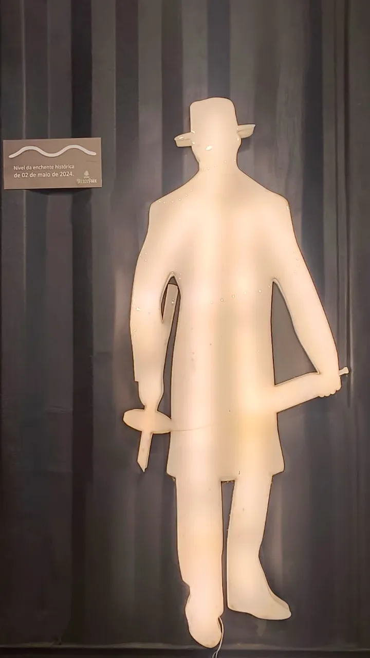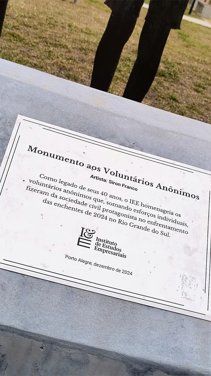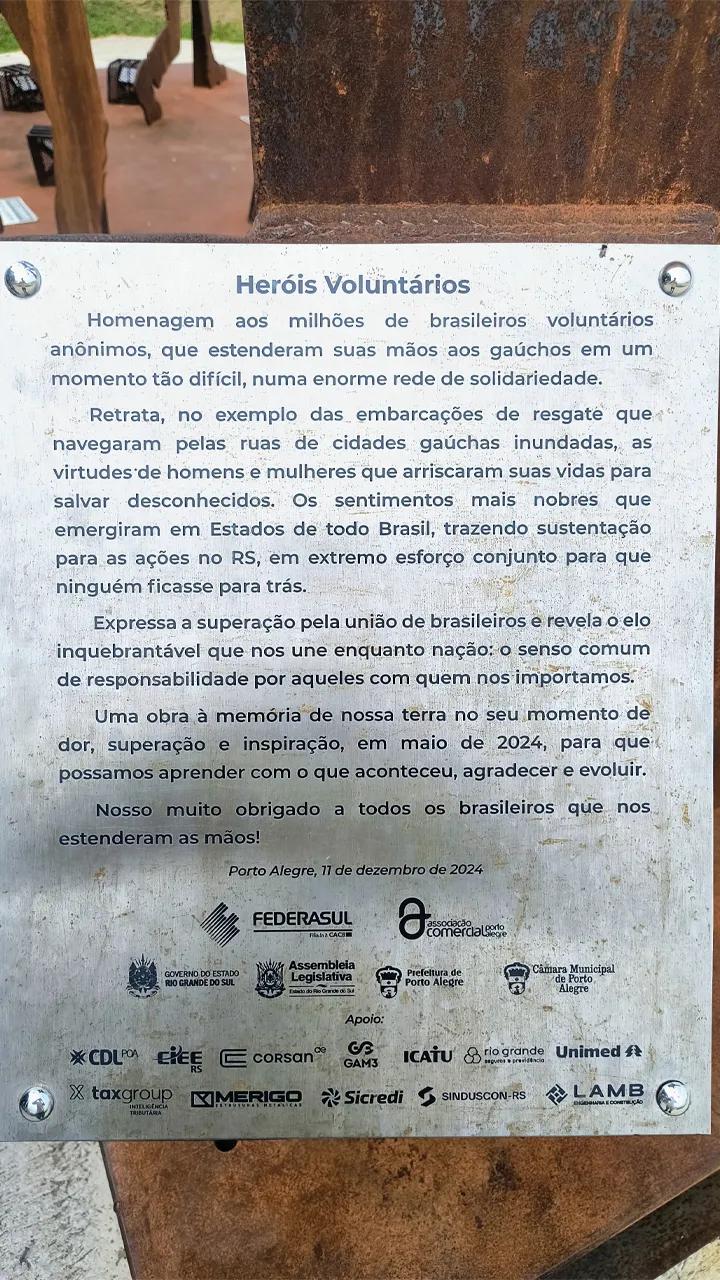 Ali na mesma pracinha, nos deparamos com o Monumento aos Voluntários Anônimos das Enchentes no Rio Grande do Sul, uma homenagem linda e comovente a todas as pessoas que, de forma desinteressada, colocaram a vida em segundo plano para ajudar quem mais precisava durante as enchentes. O monumento representa não apenas os rostos, mas a alma solidária do povo gaúcho, que se uniu num dos momentos mais difíceis da história recente do estado.