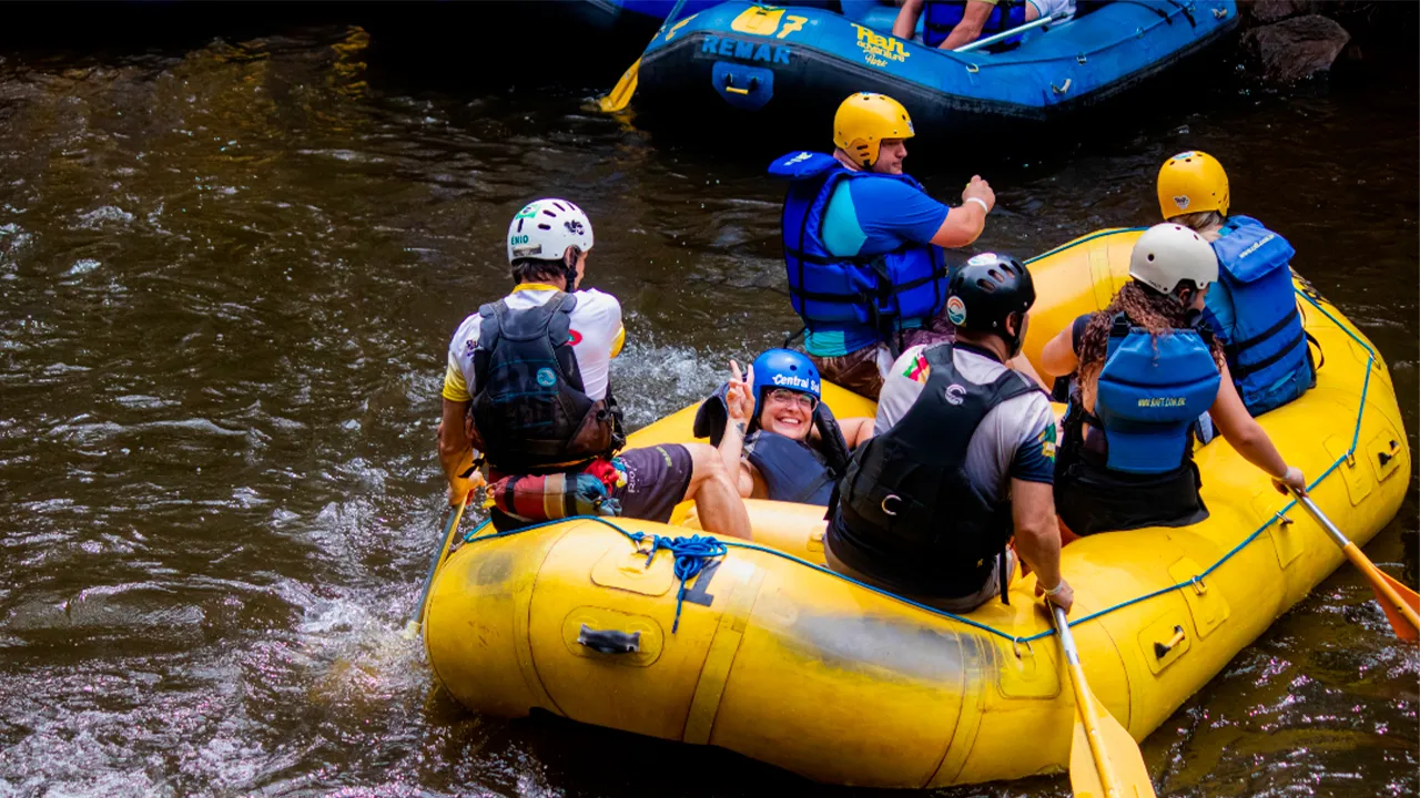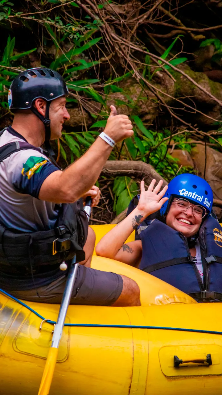 Enquanto isso, John e o pessoal do Caramujinho foram para a trilha. Já dentro do bote, junto do meu acompanhante, do guia e de outros aventureiros, senti aquele friozinho na barriga típico de primeira vez. O fotógrafo Jordan (@jordan.fauth) estava lá registrando tudo com muito carinho. O rafting foi uma delícia! Tirando umas pedrinhas que bateram no bumbum (rsrs), foi tudo tranquilo e emocionante.