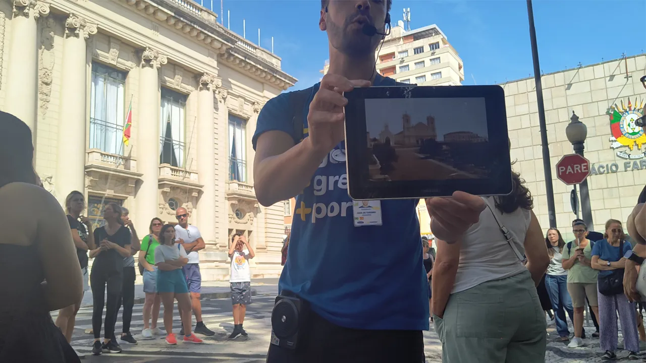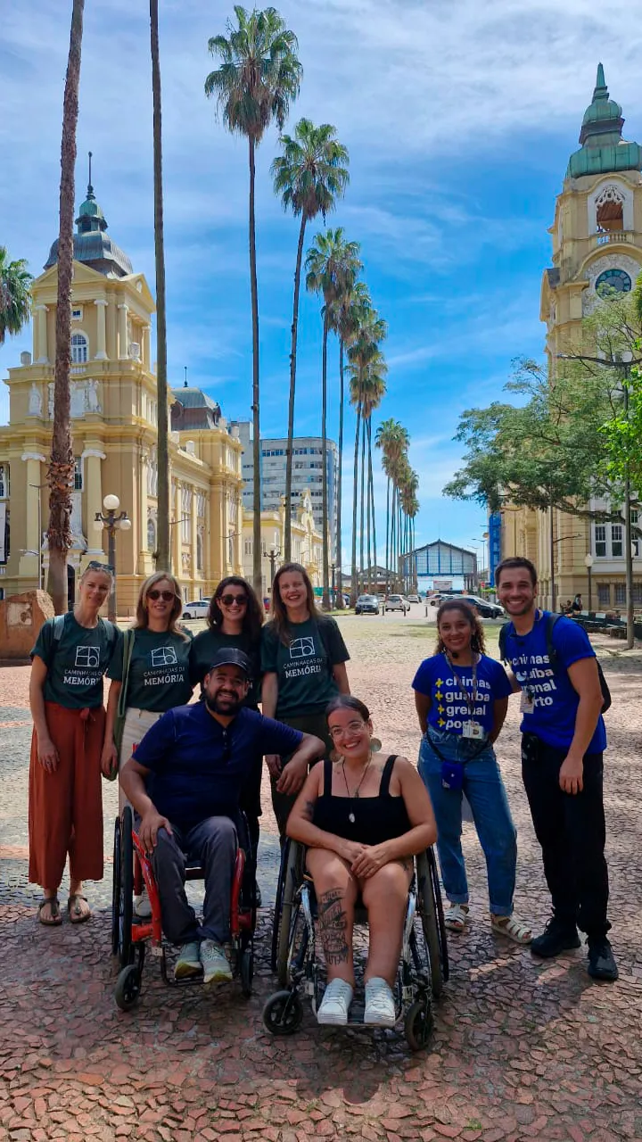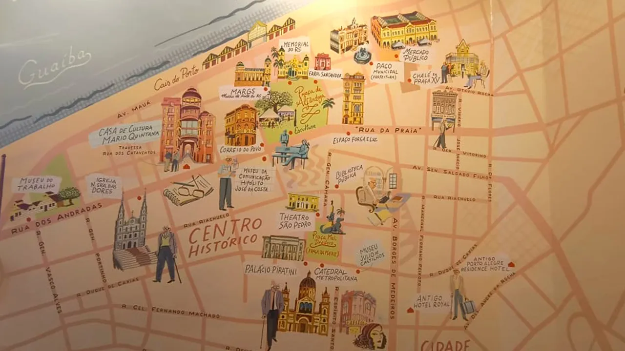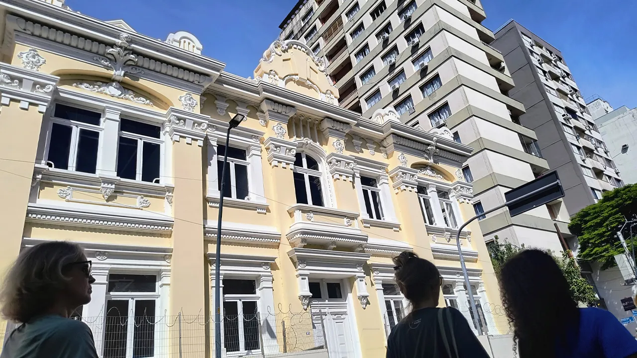 Em seguida, participamos do passeio Caminhadas da Memória – Ruas de Porto Alegre e suas histórias, conduzido por um guia muito atencioso e conhecedor da história da cidade. Mari esteve conosco durante todo o percurso, nos acompanhando com carinho e entusiasmo. Durante a caminhada, exploramos pontos históricos marcantes de Porto Alegre, como o Mercado Público, símbolo da tradição e da resistência cultural da cidade; a Praça da Alfândega, cheia de vida e palco de tantos eventos culturais; e a emblemática Rua dos Andradas (Rua da Praia), repleta de histórias que atravessam gerações.