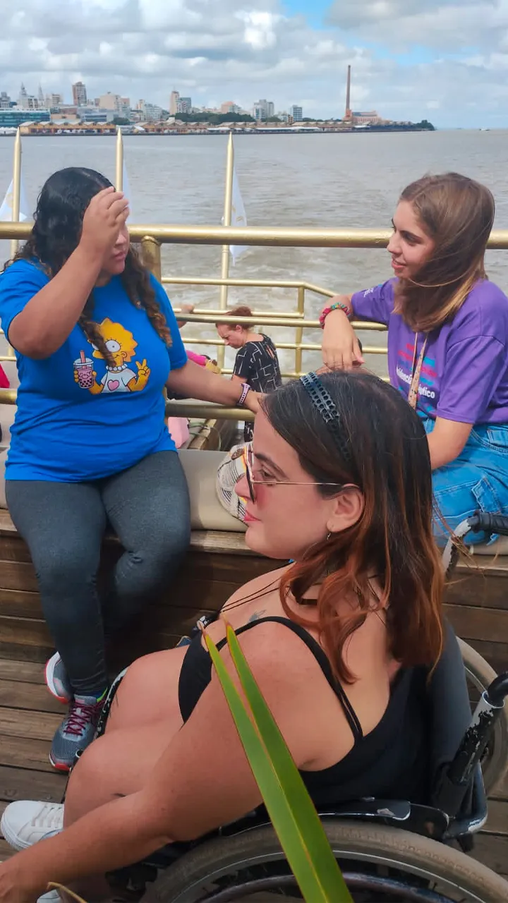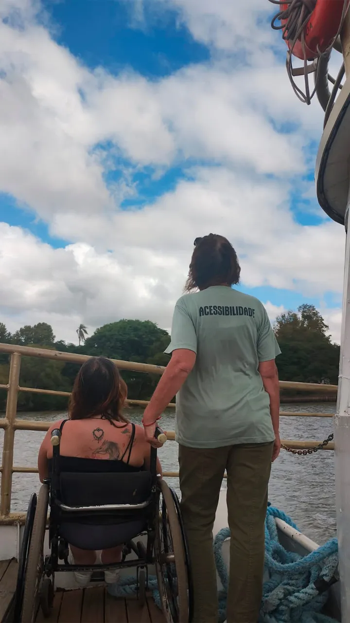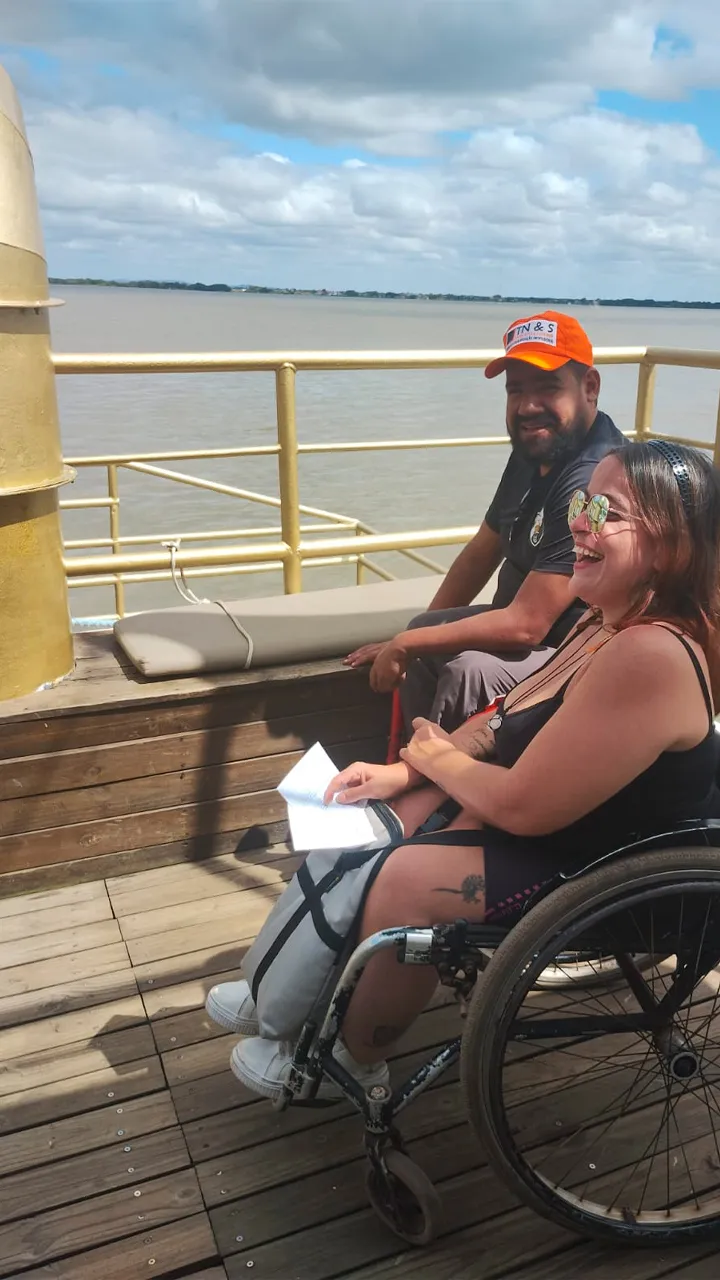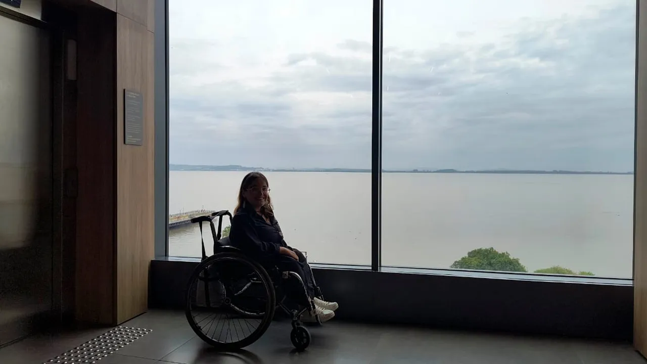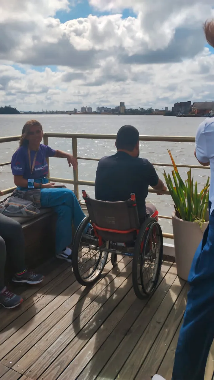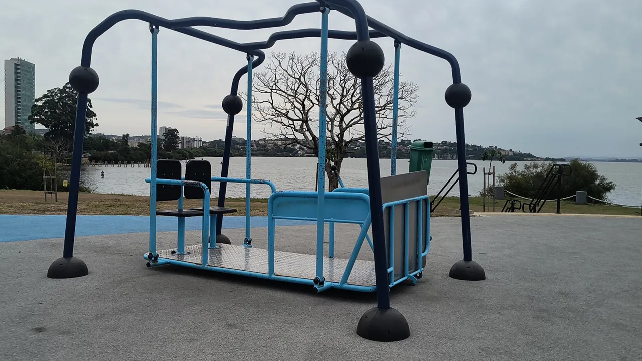 Do lado de fora, há uma pracinha muito agradável de frente para o Guaíba, com uma vista linda. E foi ali que tivemos uma grata surpresa: encontramos um balanço adaptado para cadeirantes. Ver esse tipo de acessibilidade espalhado pelos espaços públicos aquece o coração e mostra que a inclusão está, aos poucos, ganhando mais espaço.