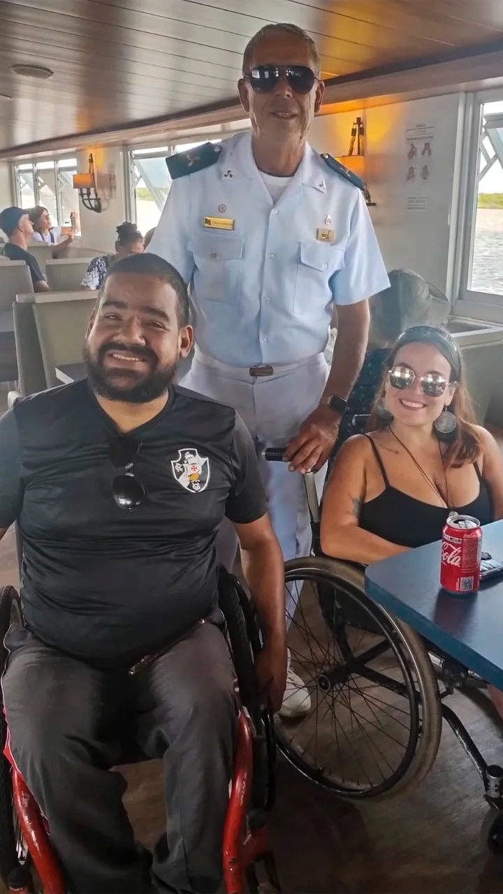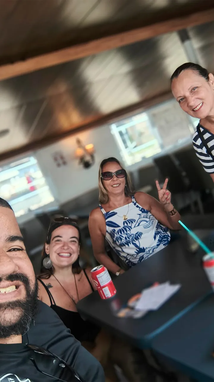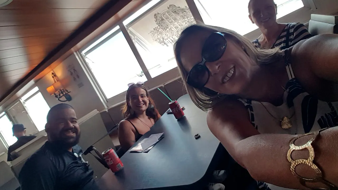 Eba! Chegou a hora de embarcar! Subimos a bordo do Cisne Branco e logo de cara conhecemos duas mulheres super simpáticas e bem-humoradas. O destino nos uniu e acabamos ficando todos na mesma mesa. Para nossa surpresa, uma delas até reconheceu a gente por conta da reportagem que saiu na Record — foi um momento especial e divertido!