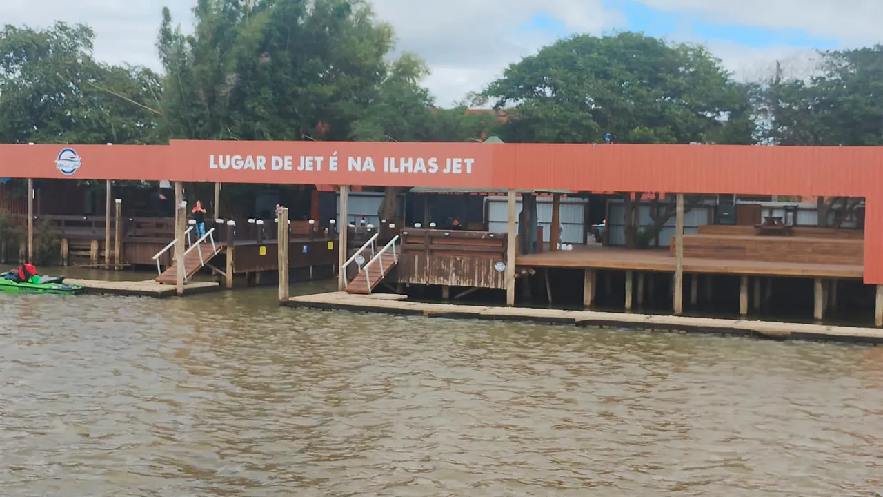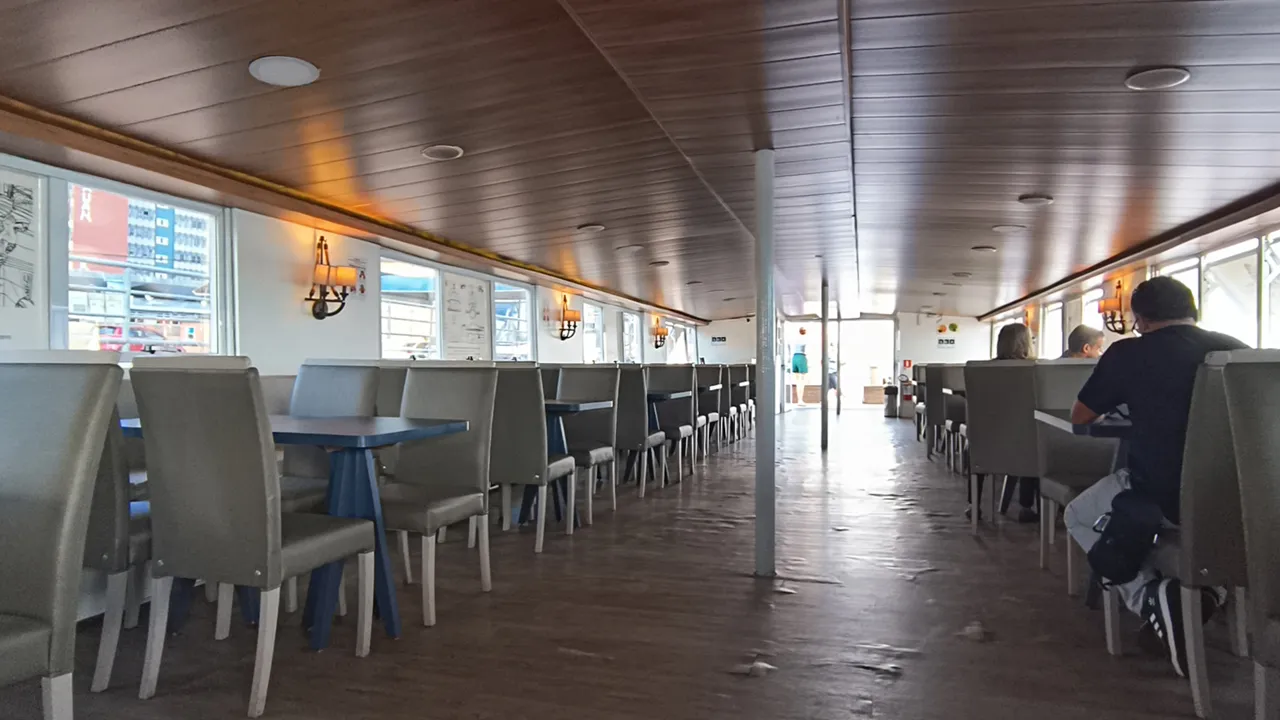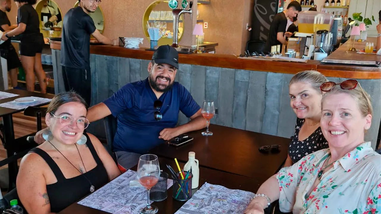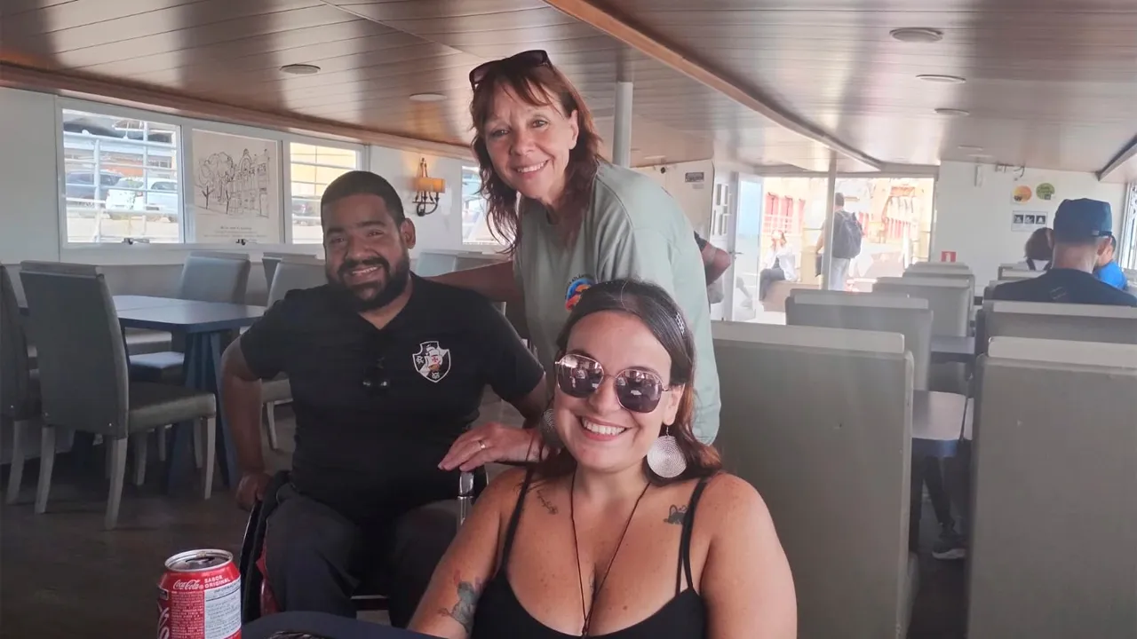 Eba! Chegou a hora de embarcar! Subimos a bordo do Cisne Branco e logo de cara conhecemos duas mulheres super simpáticas e bem-humoradas. O destino nos uniu e acabamos ficando todos na mesma mesa. Para nossa surpresa, uma delas até reconheceu a gente por conta da reportagem que saiu na Record — foi um momento especial e divertido!