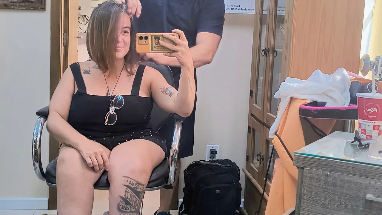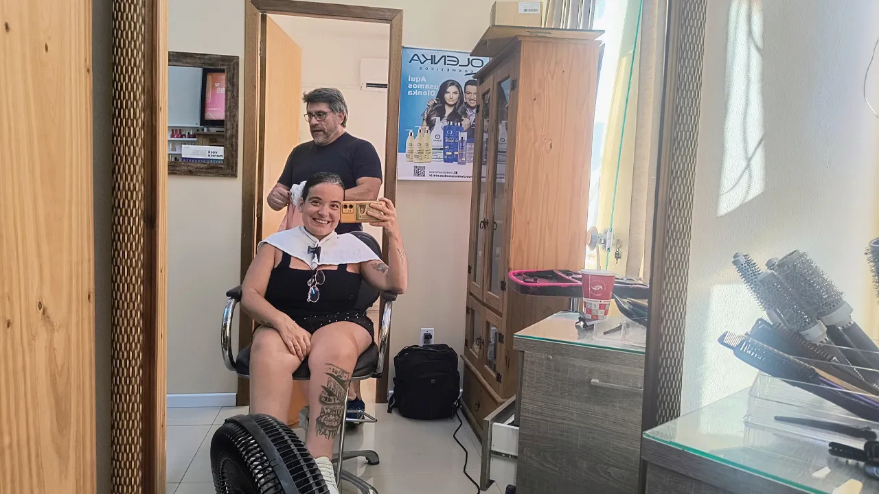 Para finalizar o dia com mais um cuidado especial, fomos até o salão de beleza, onde a Sthéfanie cortou o cabelo e saiu de lá ainda mais confiante. Foi um momento de carinho, autoestima e renovação.