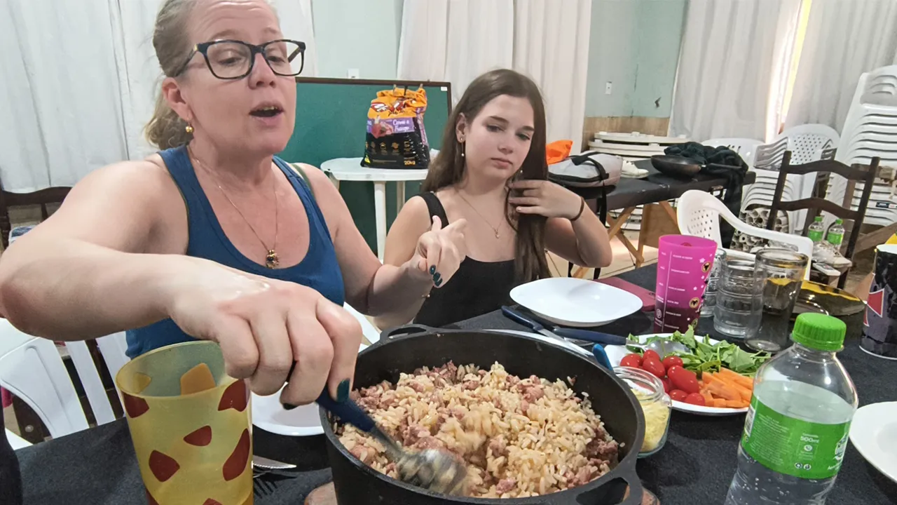 Ela chegou acompanhada da filha, a Marina, que mais tarde saiu para passear com as amigas. Enquanto isso, Mari ficou com a gente, preparando um almoço delicioso que caiu como uma bênção no meio do caos. E ainda trouxe chocolate pra sobremesa, o que fez tudo ficar ainda melhor.