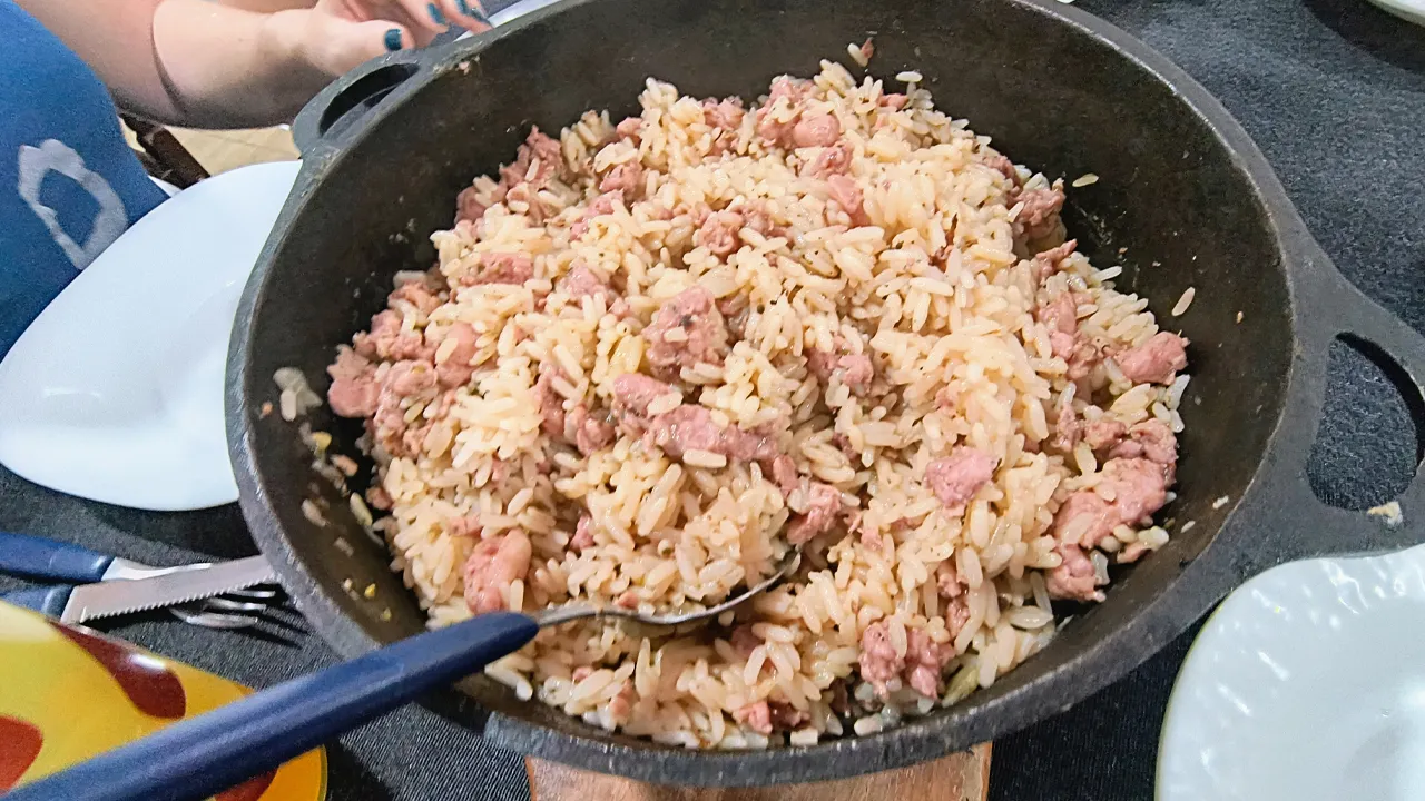 Hoje o dia foi de faxina e cuidado com o lar sobre rodas. John resolveu tirar o carpete do carro para dar aquela renovada, enquanto isso, eu fiquei responsável por lavar o porta-pote e a geladeira. Como a missão era grande e o tempo curto, nossa querida amiga Mari apareceu para nos salvar — veio preparar um almoço especial pra gente, já que estávamos completamente ocupados.